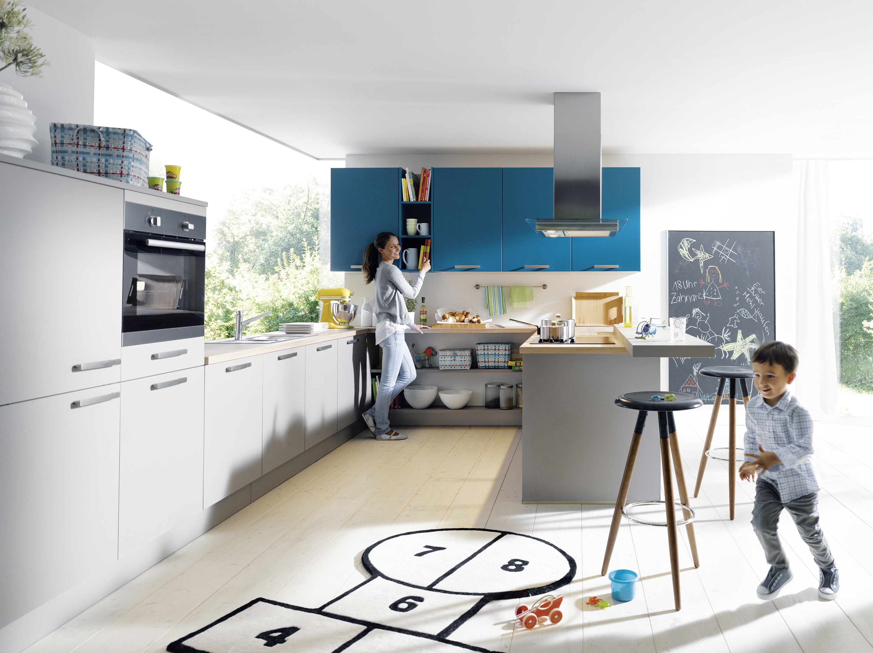 Neben der Palette der Grautöne kommen auch Blautöne zurück auf die Möbel. Blau ist eine klare und kalte Farbe, kann aber als Akzent im Ober- oder Unterschrank oder als Hingucker beim freistehenden Kühlschrank, sehr sympathisch wirken. Mit der Farbe Blau assoziiert der Mensch immer etwas Würdiges, Zuverlässiges und durch und durch Sicheres. Kombiniert mit einem naturbelassenen Echtholzton, wie zum Beispiel der beliebten Eiche als Tisch oder Arbeitsfläche, wirkt eine solche Küche stets frisch, einladend und vertrauenerweckend. Blauvarianten reichen vom hellen Blau bis hin zum mediterranen Türkis. Wenn man sich für eine farbliche Zweierkombination entscheidet, ist das oft auch schon genug. Die Gegenstände des täglichen Gebrauchs sowie die aus dem Dekorationsbereich sind in aller Regel unterschiedlich bunt und lassen die neue Küche dann schnell sehr persönlich und individuell gemütlich wirken.