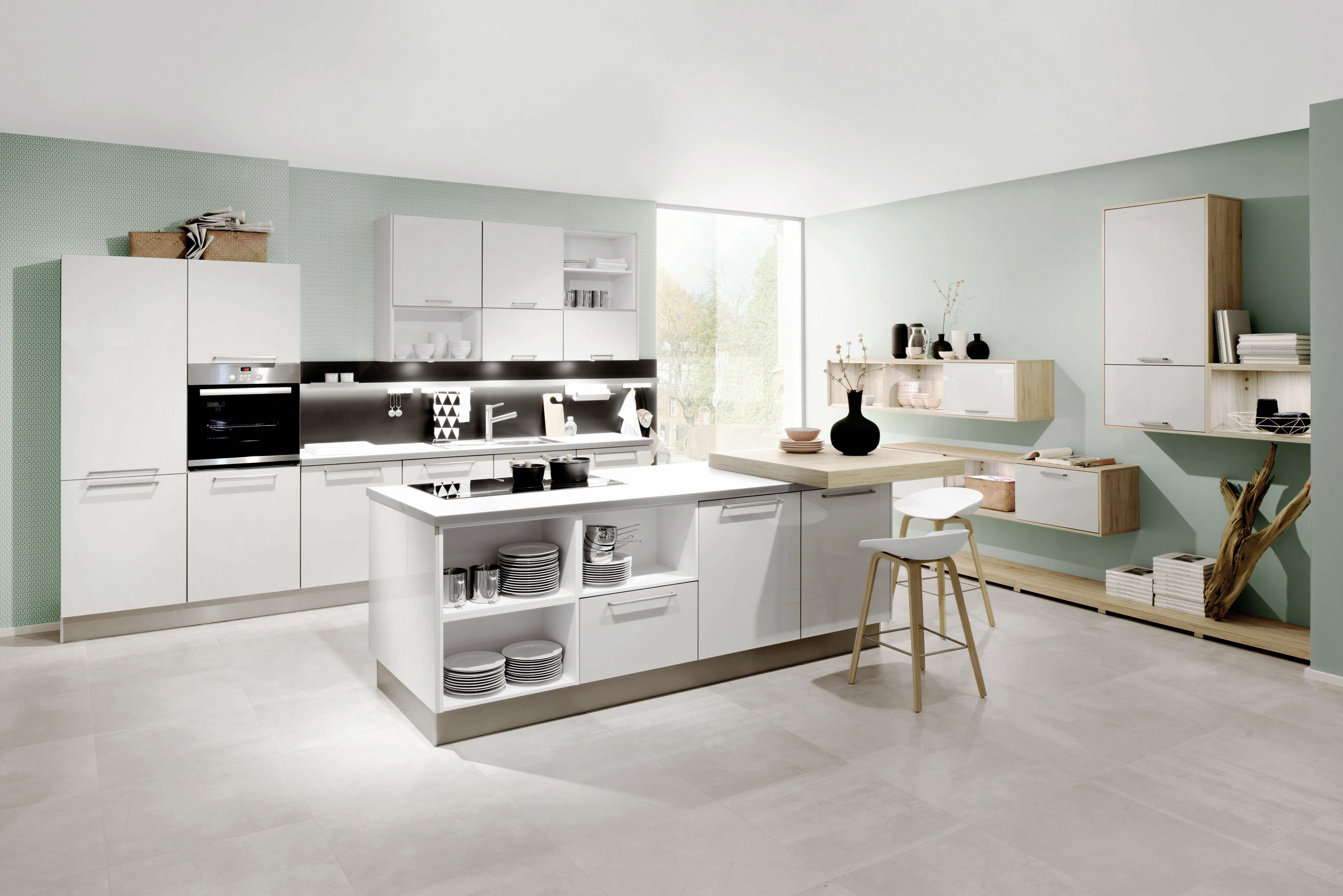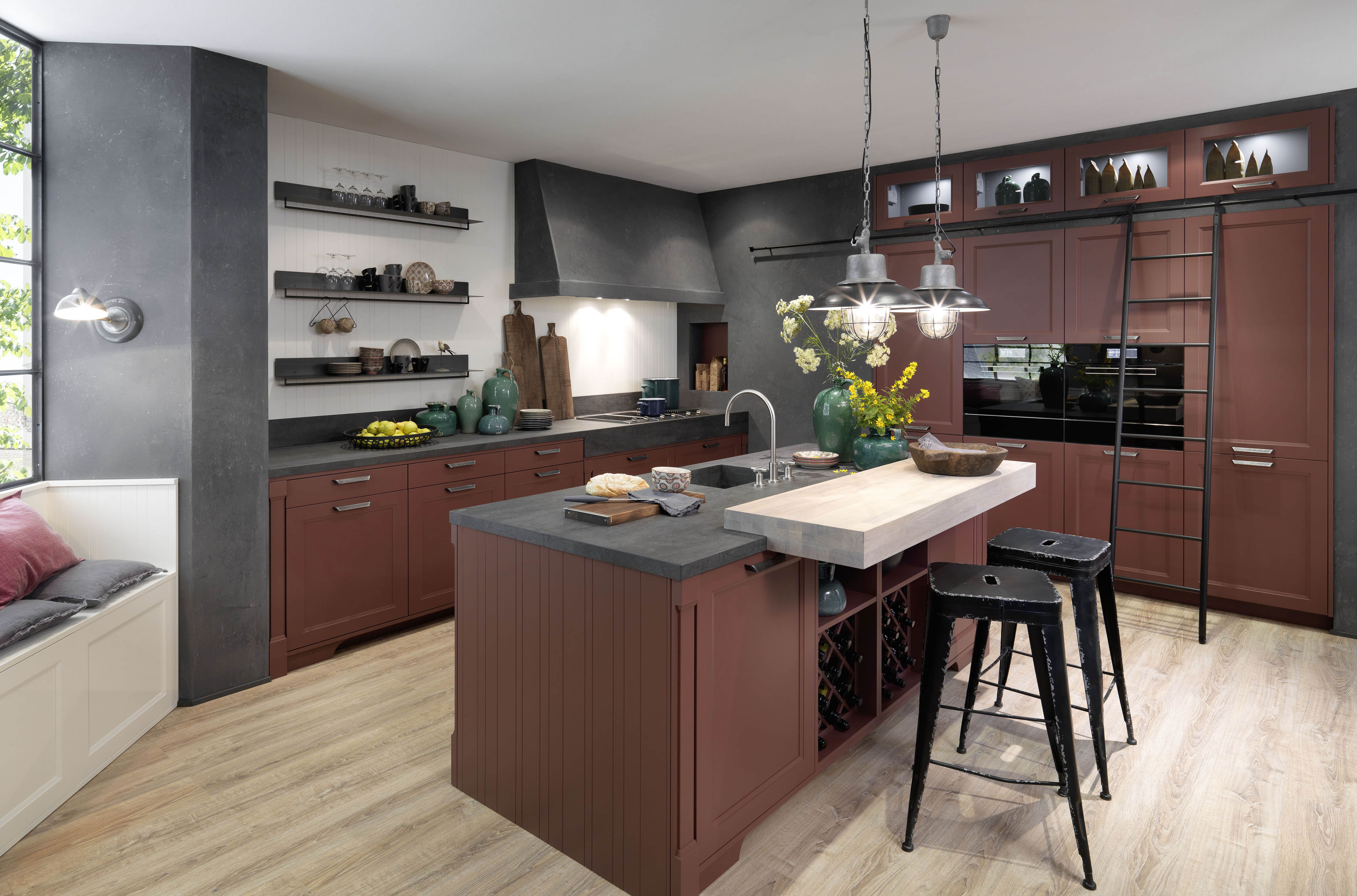 Möglichkeiten zur Realisierung eines gemütlichen Sitz-/Essplatzes gibt es viele. Beliebt sind Kochinseln mit einer integrierten Essbar auf der Vorder- oder Rückseite. Oder mit einer aufgesetzten Esstheke und ein paar dekorativen Hockern oder Stühlen, die davor platziert werden. Ebenfalls attraktiv und sehr wohnlich wirkt eine Koch-, Spül- oder Vorbereitungsinsel mit einer verlängerten Arbeits- oder einer aufgesetzen Tischplatte. Die Sitzstühle werden, wenn sie nicht benötigt werden, einfach darunter geschoben, sodass sie kaum Platz wegnehmen. Und selbst, wenn nur wenig Platz zur Verfügung steht, gibt es interessante Lösungen: beispielsweise ein in die Schublade oder einen Hochschrank integrierter Ausziehtisch, an den sich ein oder zwei Klappstühle stellen lassen. Optisch besonders reizvoll in einer modernen, grifflosen und urban interpretierten Landhausküche sind gemütliche Sitzbänke um einen freistehenden Esstisch herum gruppiert. Sie bringen ein ganz eigenes Flair in die neue Wohlfühlküche.