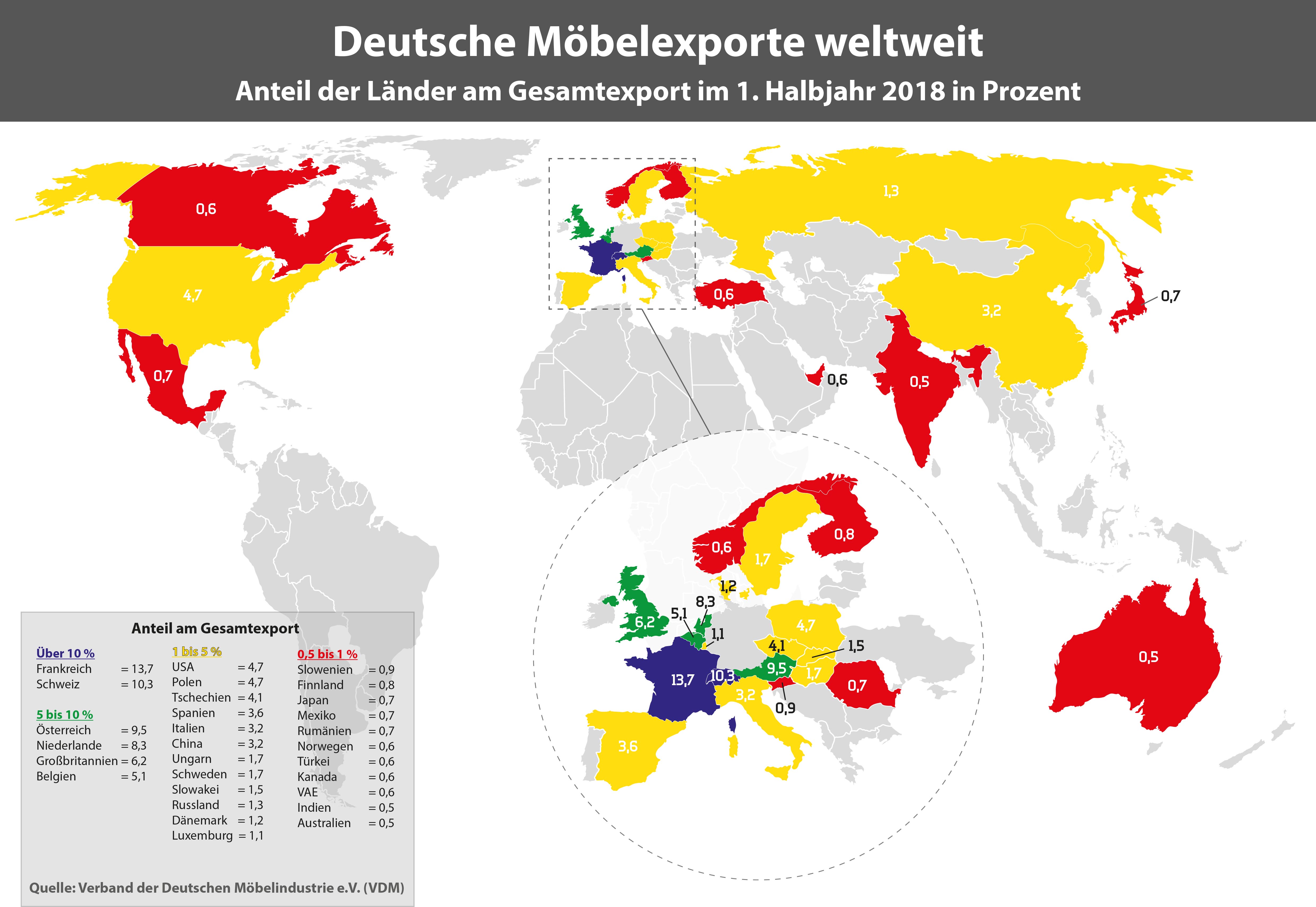 Bad Honnef. Die weltweite Nachfrage nach Möbeln aus deutscher Produktion nimmt weiter zu. Im ersten Halbjahr 2018 konnten die deutschen Möbelexporte um 2,2 Prozent auf rund 5,5 Mrd. Euro gesteigert werden. „Mit einem Anteil von knapp 70 Prozent an den Gesamtausfuhren bleibt die Europäische Union der Hauptabsatzmarkt für die deutschen Möbelhersteller, gleichwohl werden die höchsten Zuwachsraten im außereuropäischen Ausland erzielt“, sagt Jan Kurth, Geschäftsführer des Verbandes der Deutschen Möbelindustrie (VDM).
