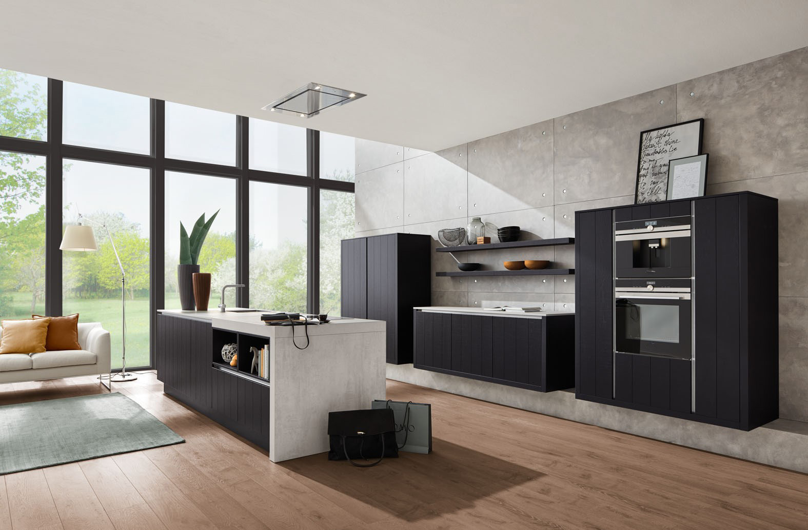 Foto 3: Leicht und nahezu schwebend wirkt dieses modular geplante, grifflose Ensemble mit Fronten in schwarzem Eiche-Furnier mit vertikaler Profilierung sowie einem Umfeld in hellem Spachtelbeton. (Foto: AMK)