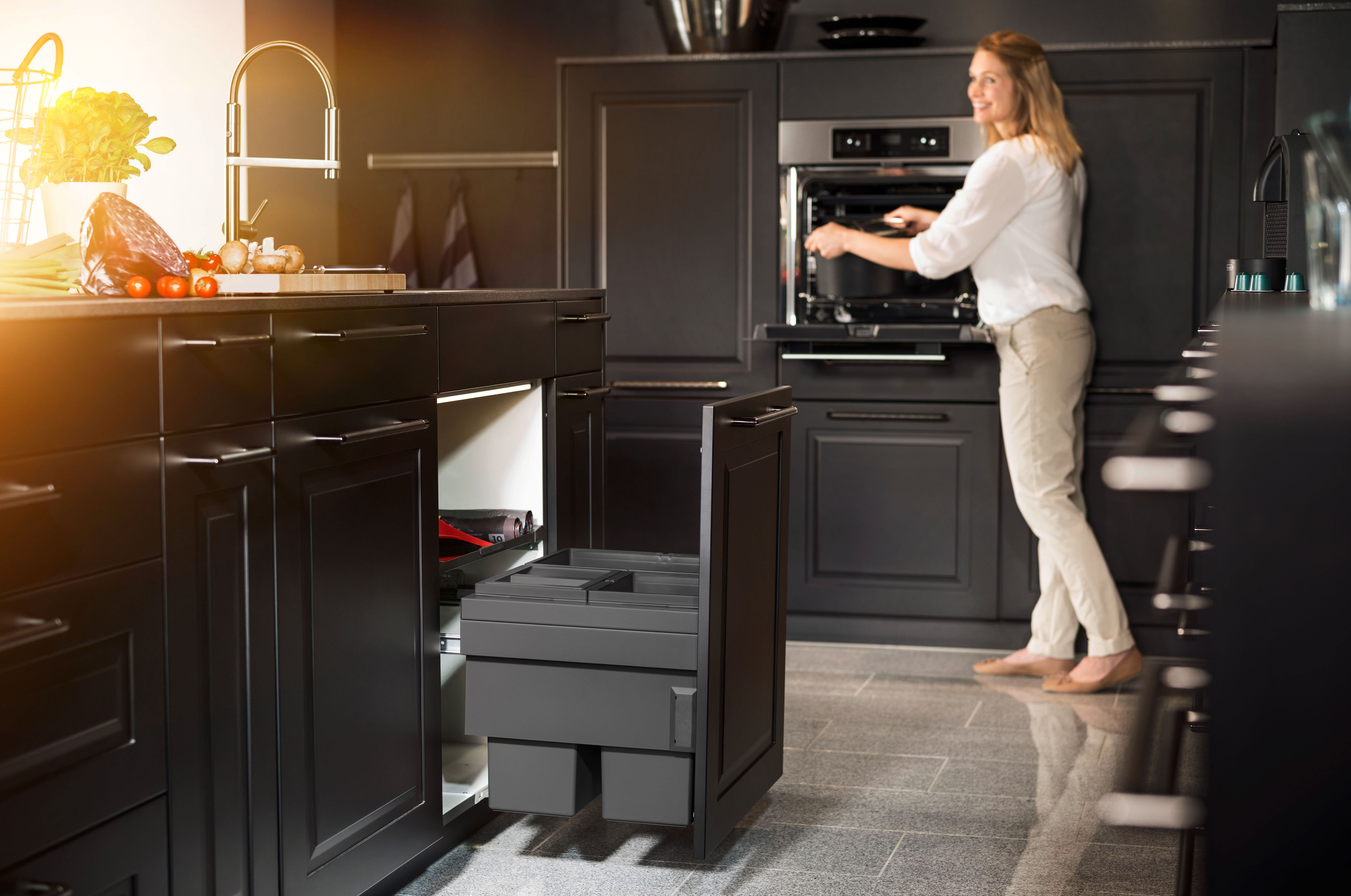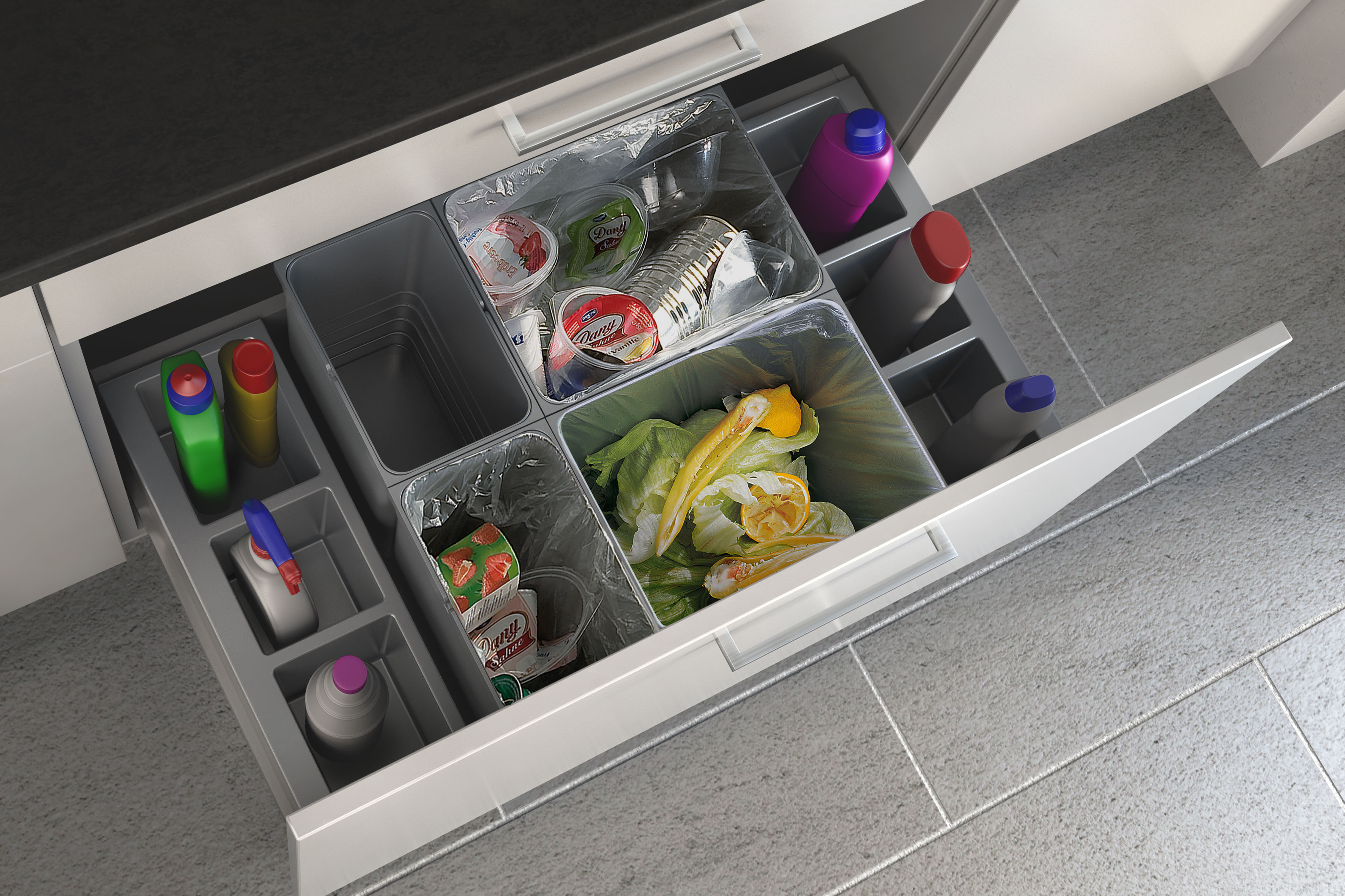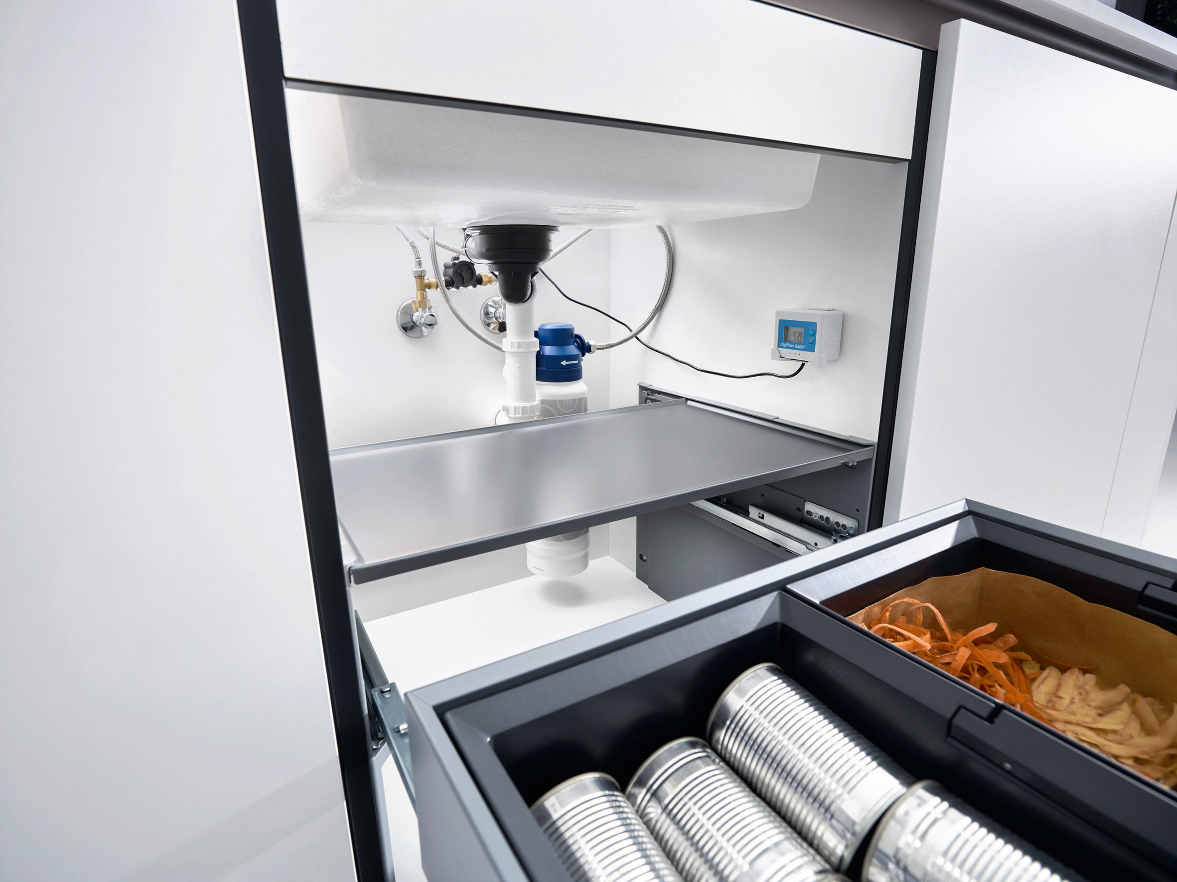 Als perfekt durchdachte und platzsparend konzipierte System-Varianten fügen sie sich überall ein – vorzugsweise in einen Spülenunterschrank, da die meisten Arbeiten in der Küche rund um die Spüle stattfinden. Beim Öffnen der Spülenschrank-Auszugsfront, am besten mithilfe einer bequemen mechanischen oder elektrischen Öffnungsunterstützung, gleiten die Kunststoffbehälter dann aus dem Unterschrank komplett und voll zugänglich heraus. Die reinigungsfreundlichen, einzeln entnehmbaren Behälter werden bei dieser Lösung in einem Frontauszug stabil und sicher stehend oder in einem stabilisierenden Positionierrahmen hängend untergebracht.