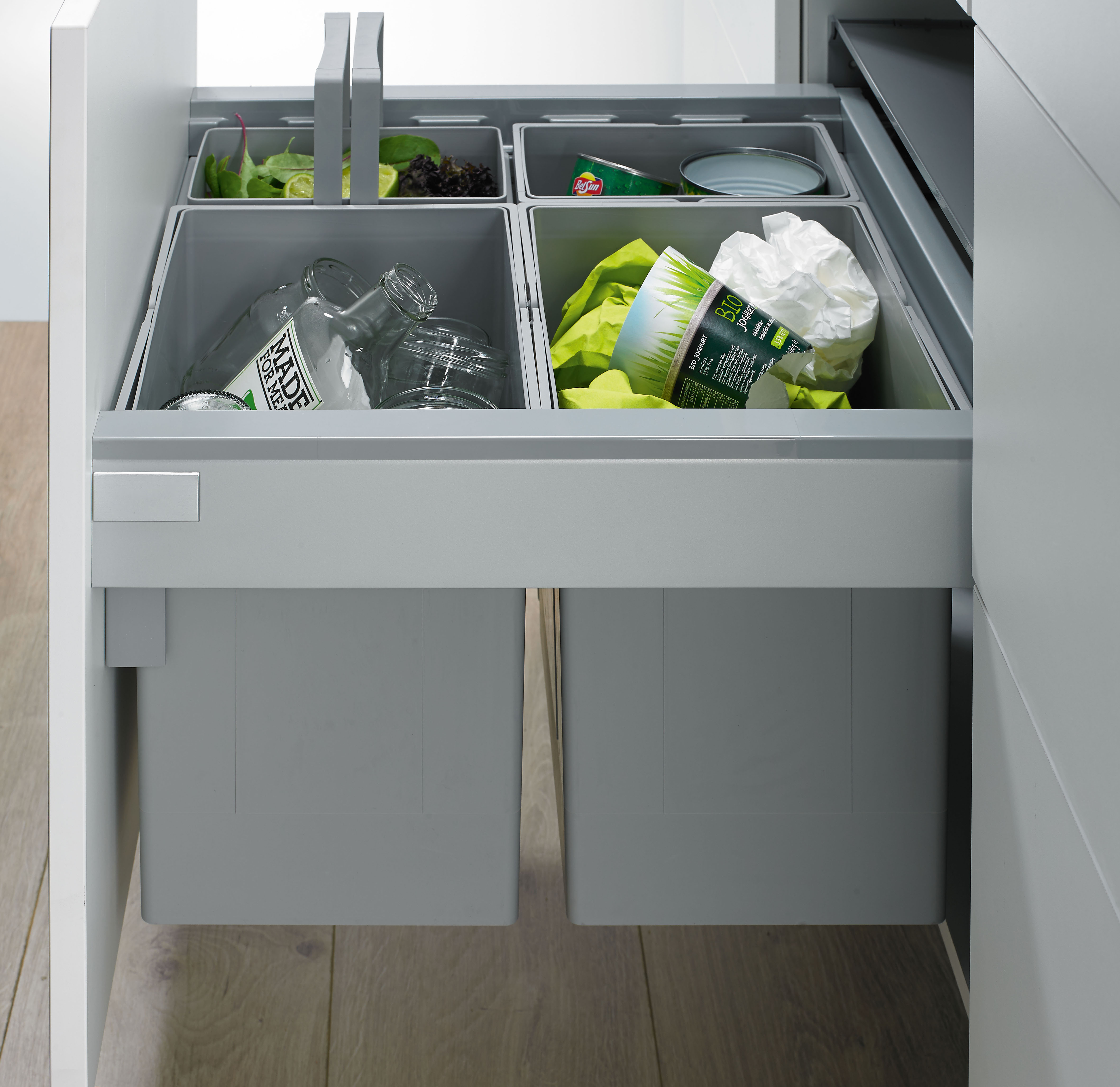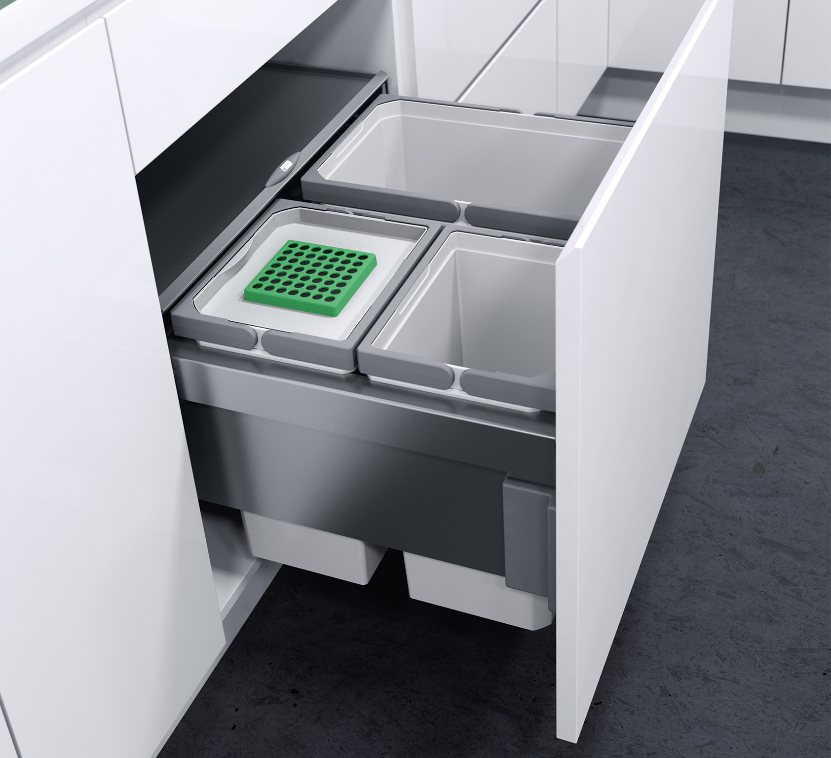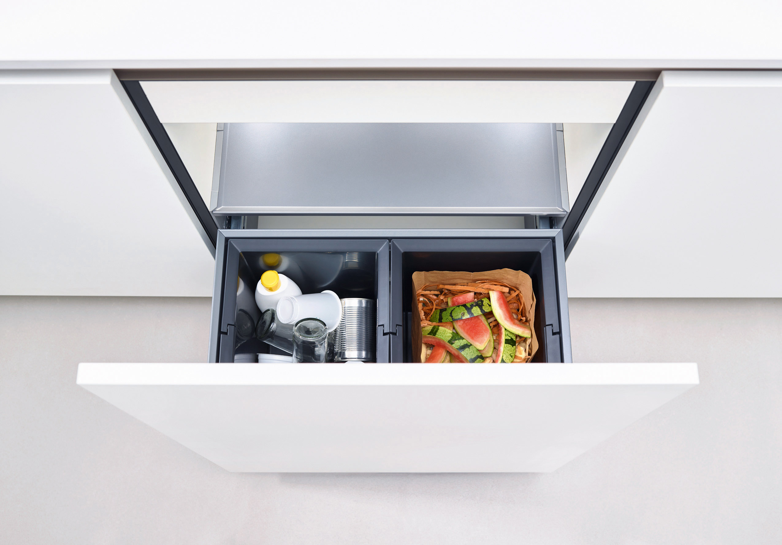 Als perfekt durchdachte und platzsparend konzipierte System-Varianten fügen sie sich überall ein – vorzugsweise in einen Spülenunterschrank, da die meisten Arbeiten in der Küche rund um die Spüle stattfinden. Beim Öffnen der Spülenschrank-Auszugsfront, am besten mithilfe einer bequemen mechanischen oder elektrischen Öffnungsunterstützung, gleiten die Kunststoffbehälter dann aus dem Unterschrank komplett und voll zugänglich heraus. Die reinigungsfreundlichen, einzeln entnehmbaren Behälter werden bei dieser Lösung in einem Frontauszug stabil und sicher stehend oder in einem stabilisierenden Positionierrahmen hängend untergebracht.