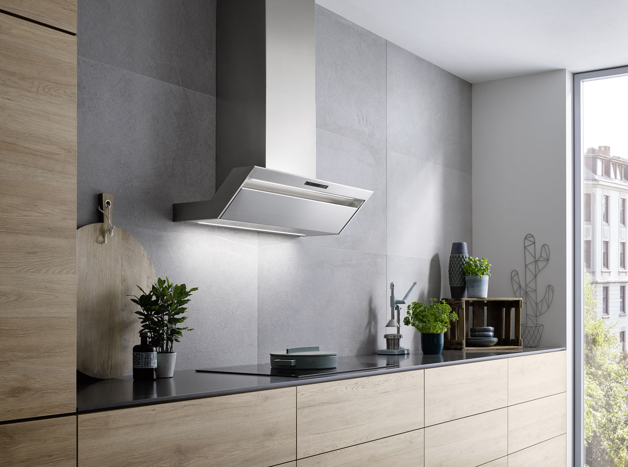 Foto 1: Direkt über dem Kochfeld montiert, sorgt diese Design-Wandhaube im abgeschrägten Design für volle Kopffreiheit sowie für eine hohe Effizienz bei der Absaugung und Luftreinigung. Ihre Hybrid-Steuerung ermöglicht den Wechsel zwischen Abluft- und Umluftbetrieb. (Foto: AMK)