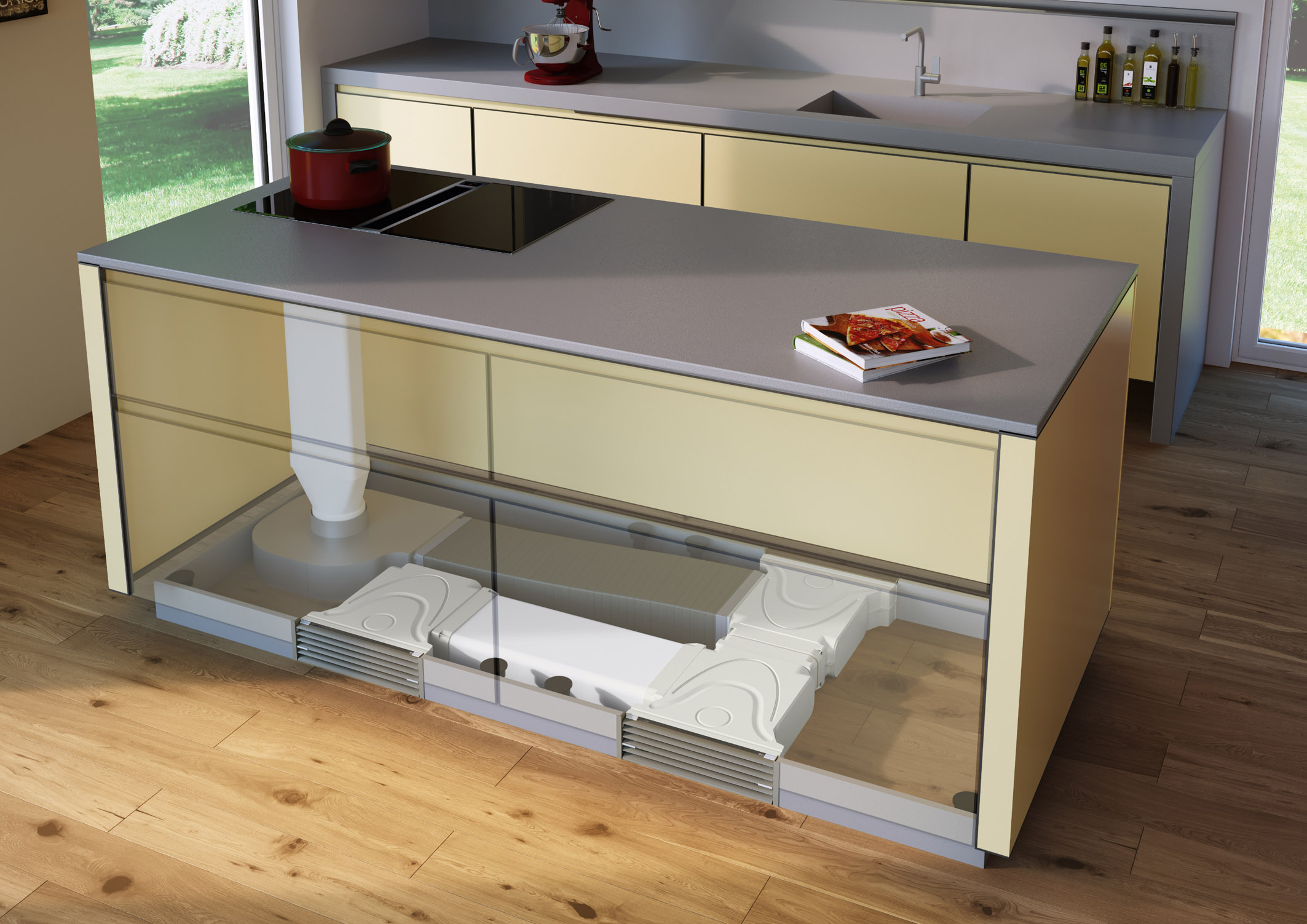 Foto 4 + 4a: Wird der Wrasen nach unten abgesaugt, empfiehlt sich ein zusätzliches Umluft-Filtersystem mit wasserabweisenden Aktivkohlefiltern im Unterschrank, das die gefilterte und von Gerüchen befreite Luft gezielt aus dem Sockelbereich herausführt. Da sie nicht mit Möbeln, Wand- oder Bodenbelägen in Berührung kommt, ist eventuellen Feuchteschäden vorgebeugt. (Foto: AMK)