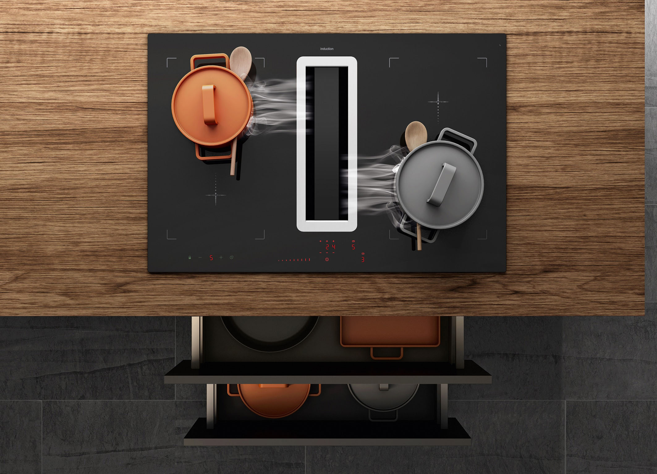 Foto 6: Kompaktes Duo zum Kochen & Lüften: Ein prämiertes Premium-Induktionskochfeld – alternativ ist auch ein HiLight-Kochfeld möglich – und ein integrierter Kochfeldabzug mit einem leistungsstarken Motor. Die Einstellungen erfolgen über Slider Sensortasten. (Foto: AMK)