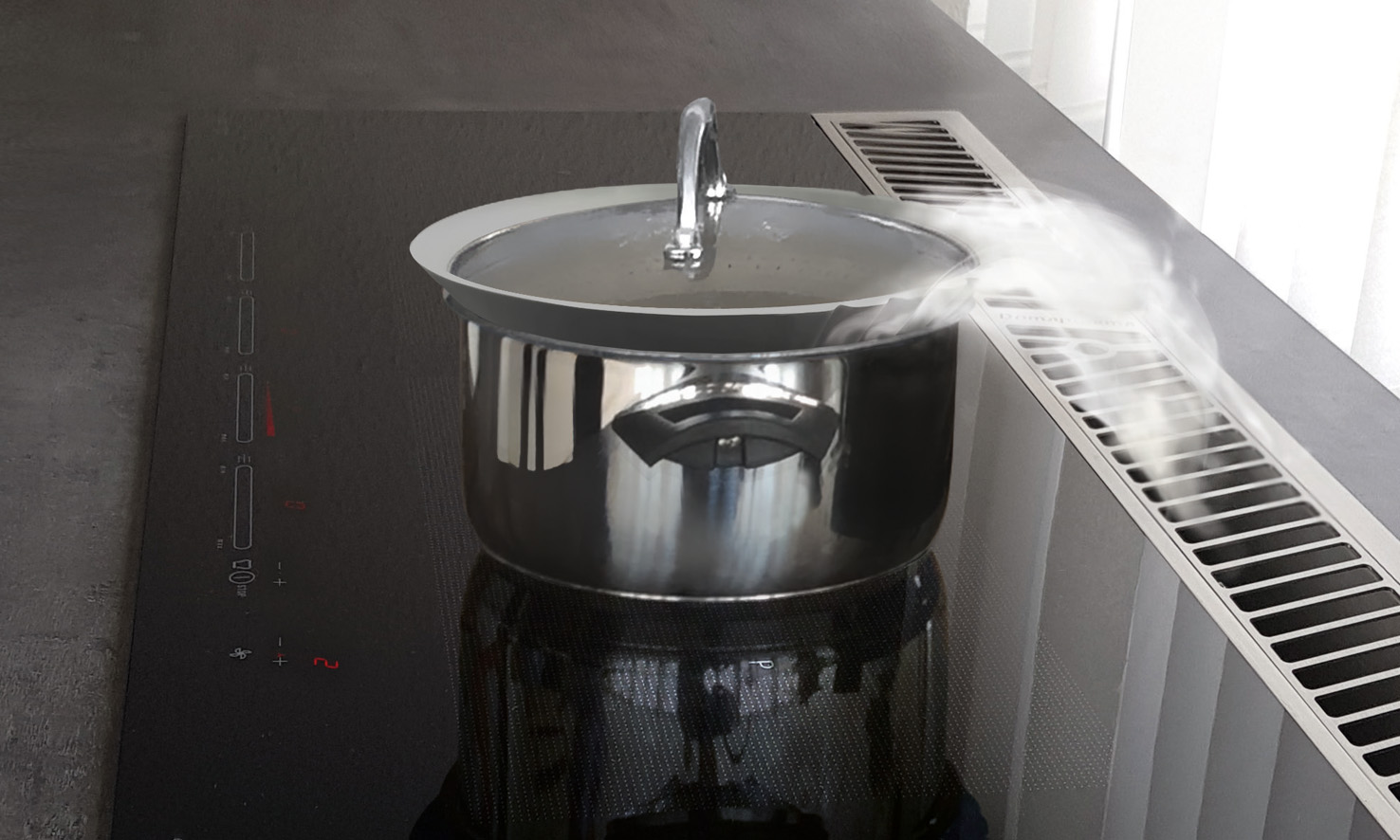 Bei Muldenlüftern – auch Kochfeldabzüge und Tischlüfter genannt – sowie den stark im Trend liegenden Induktionskochfeldern mit integriertem Dunstabzug werden die Kochschwaden entgegen den physikalischen Gesetzen nach unten abgesaugt. Deshalb ist bei diesen Downdraftsystemen eine deutlich höhere Lüfterleistung nötig als bei anderen Haubenarten. Damit der Wrasen auch bei Verwendung von hohen Töpfen vollständig erfasst wird, gibt es zum Beispiel Silikon-Topfringe in verschiedenen Größen, die die Absaugleistung einer Muldenlüftung noch optimieren können. Bei der Wahl eines Downdraftsystems im Umluftbe¬trieb empfiehlt sich der Einbau eines zusätzlichen, geschlossenen Luftkanalsystems im Küchenunterschrank, das die gefilterte Luft gezielt aus dem Sockelbereich herausführt und so Feuchteschäden an Möbeln, Wand- oder Bodenbelägen vorbeugt.