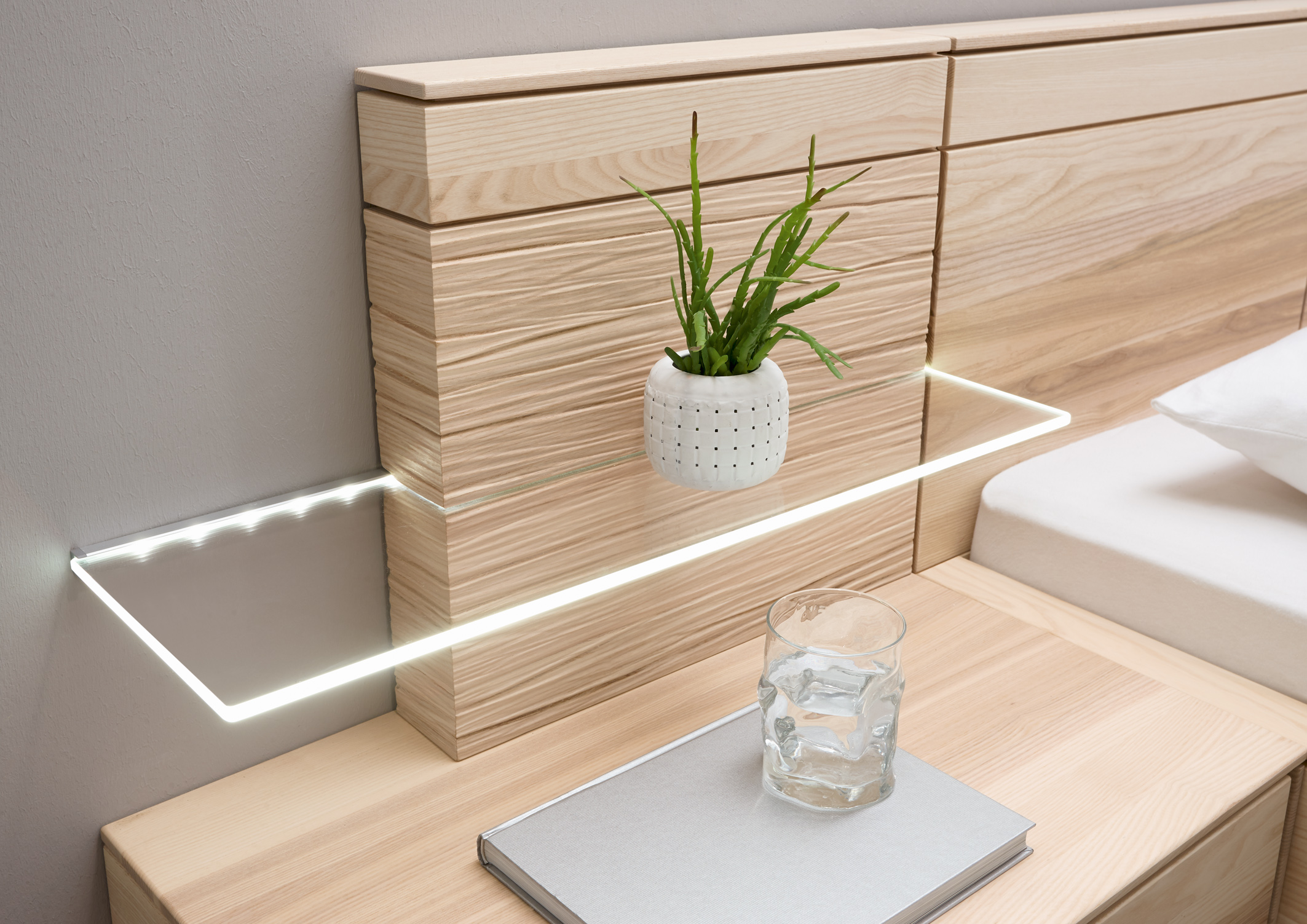 Bild 1: Die Wildesche kann durch ihre weißliche bis rotbräunliche Farbe sehr gut mit Erdtönen kombiniert werden. Das Kopfteil mit Lodenbezug schmiegt sich harmonisch an das Bettgestell an. Foto: IPM/Thielemeyer