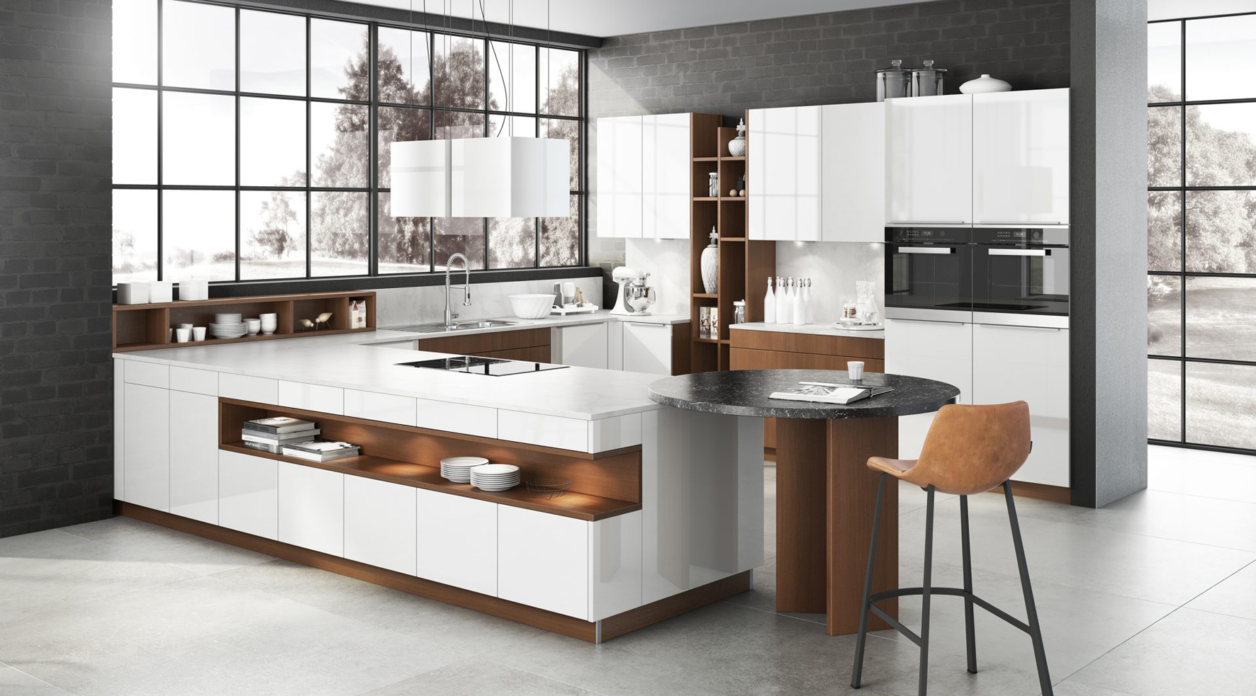 Foto 10: Weiß, der zeitlose Klassiker. Hier in einer modernen U-förmigen Interpretation – weiße Hochglanzlackierung trifft auf wohnliches Echtholzfurnier. Feine Akzente setzen die Einbaugeräte in Schwarzglas/Edelstahl, das Umfeld und die runde Tischplatte in dunkler Marmoroptik. (Foto: AMK)