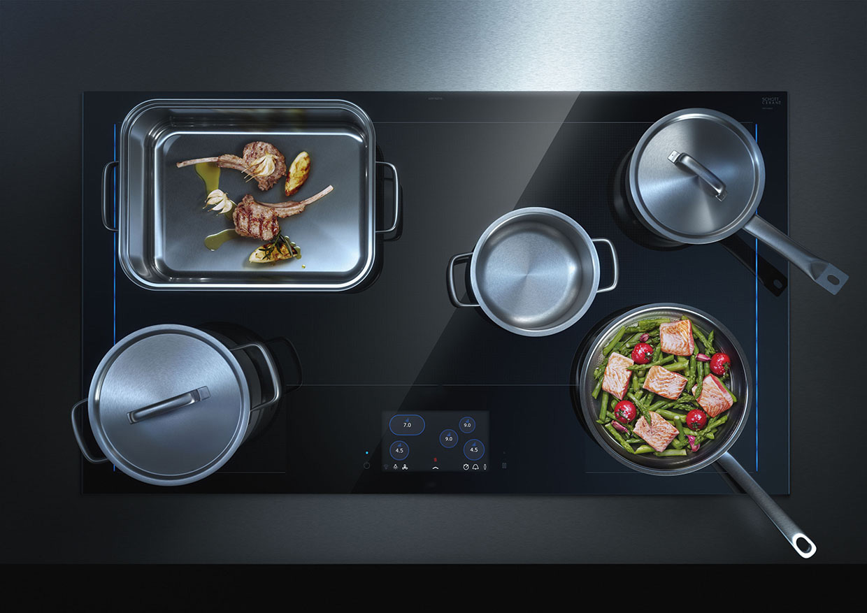 Foto 2: Kochen mit Induktion bietet viele Vorzüge. Bei diesem Premium-Vollflächen-Induktionskochfeld kann das Kochgeschirr auf der gesamten Glaskeramik¬fläche an beliebiger Stelle platziert werden. Die Anzahl, Größe und Position des Kochgeschirrs werden automatisch erkannt. (Foto: AMK)