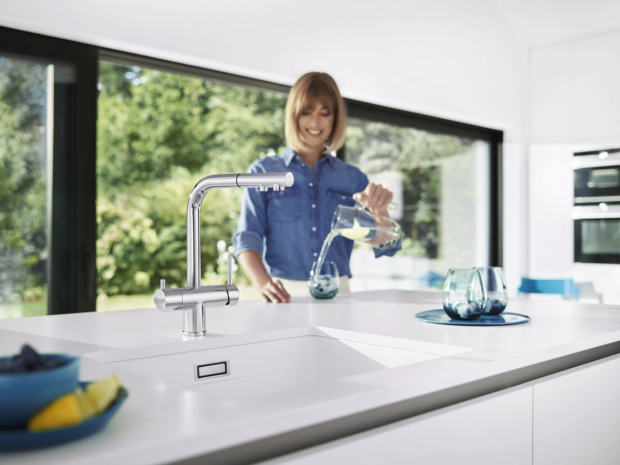 Foto 6: Verfeinerte Trinkgenüsse an der Spüle ermöglicht diese 3in1-Küchenarmatur für gefiltertes sowie ungefiltertes Kalt- und Warmwasser. Ein hochwertiger, mehrstufiger Filter im Unterschrank reduziert den Kalk im Wasser und verbessert seinen Geschmack. (Foto: AMK)