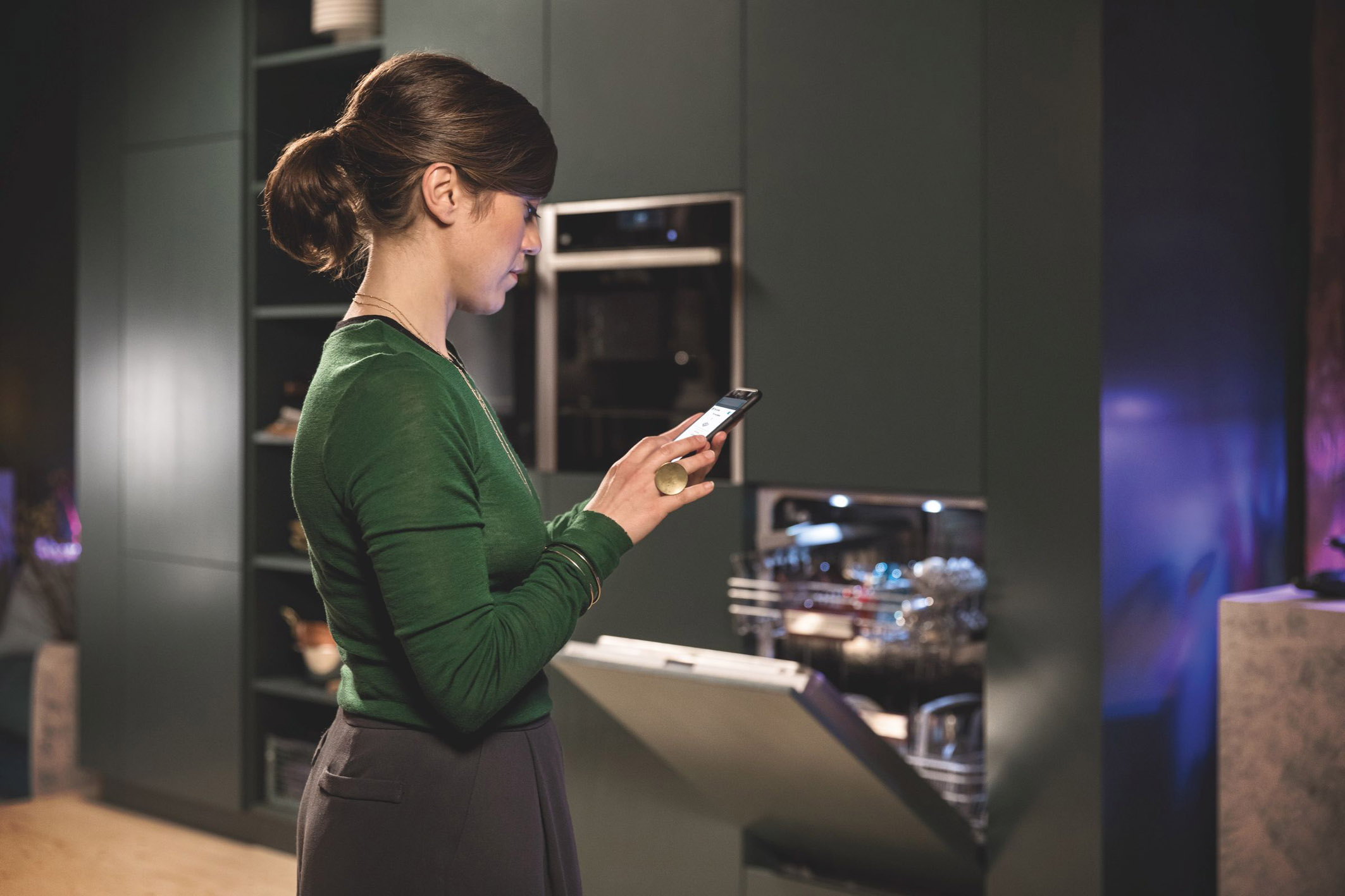 Foto 7: So wird die neue Lifestyle-Küche zur Smart Kitchen. Viele Hausgeräte wie z. B. dieser Geschirrspüler und Dampfbackofen sind Connectivity-fähig. Das gilt auch für Dampfgarer, Kühlgefrierkombinationen, Einbau-Kaffee-vollauto¬maten, Kochfelder und Dunstabzugshauben. (Foto: AMK)