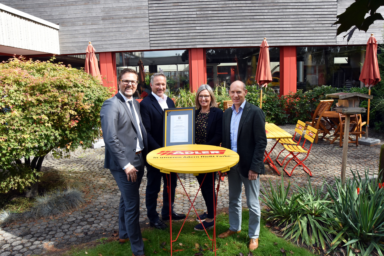 Bild: (v.l.n.r.) Daniel Pesserer (Verkaufsleiter Möbelindustrie ADLER), Jochen Winning (Geschäftsführer DGM), Andrea Berghofer (Geschäftsführerin ADLER), Christian Schütz (Key Account Manager Möbelindustrie Deutschland und Österreich ADLER). Foto: DGM