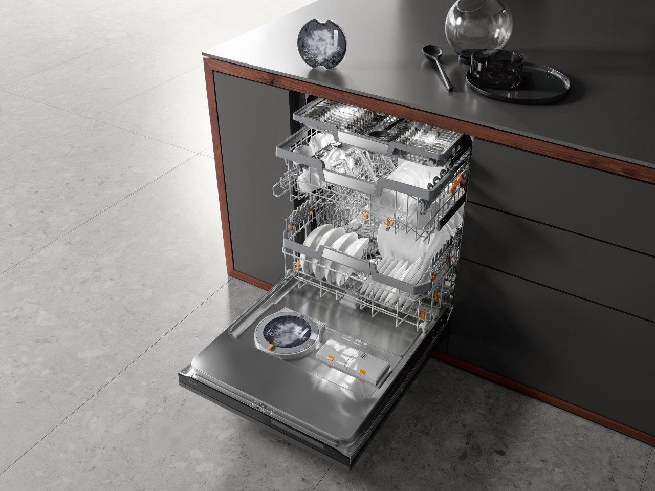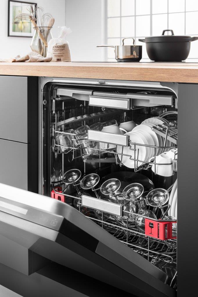 „Eine sehr intelligent durchdachte Aufteilung des Innenraums nutzt jeden Zentimeter“, sagt AMK-Chef Volker Irle. „Wird im Oberkorb mehr Platz für hohes Spülgut benötigt, verstellt man ihn einfach in der Höhe.“ Spezielle Halterungen ermöglichen es, auch feine, langstielige Gläser, hohe Vasen oder Glaskaraffen im Unterkorb sicher zu verstauen. Essbesteck, Kochlöffel, Kellen oder z. B. kleine Espressotassen kommen in die herausnehmbare Besteckschublade, die zudem einiges an Verstellmöglichkeiten bietet.