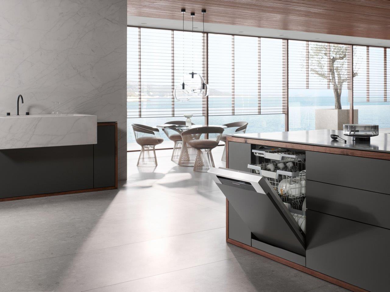Sehr leiser Spüler (37 dB im Extraleise-Programm) mit geräumiger Besteckschublade, sanft gleitenden Geschirrkörben und einer speziellen Liftfunktion: Dadurch lässt sich der Unterkorb mit nur einem Handgriff auf eine angenehme Höhe zum Be- und Entladen der Spülgutes anheben. (Foto: AMK)
