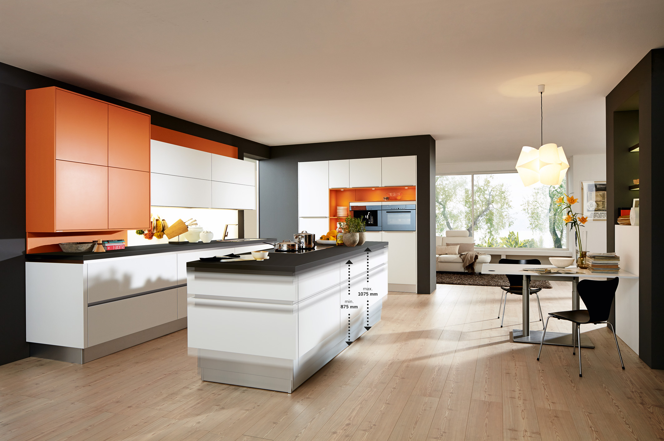 Dank eines Hubsockelsystems kann die Arbeitshöhe um bis zu 20 Zentimeter verstellt werden. Mit elektromotorischen Antrieben lassen sich die Arbeitsplatte und die Küchenschränke leise und stufenlos anheben und absenken. Egal, ob die Hobbyköche 1,60 Meter oder 2 Meter groß sind – jeder findet eine ideale Arbeitshöhe, um bequem Gemüse oder Fleisch zu schneiden, Gerichte auf dem Kochfeld zuzubereiten und Töpfe im Spülbecken abzuwaschen. Auf diese Weise werden eine ungünstige Körperhaltung und die daraus oftmals resultierenden Rückenbeschwerden vermieden. Mehrere Höhen lassen sich fest einprogrammieren. Zudem müssen sich große Menschen beim Griff in die Unterschränke weniger stark bücken, da auch die Schränke mit in die Höhe gefahren werden.