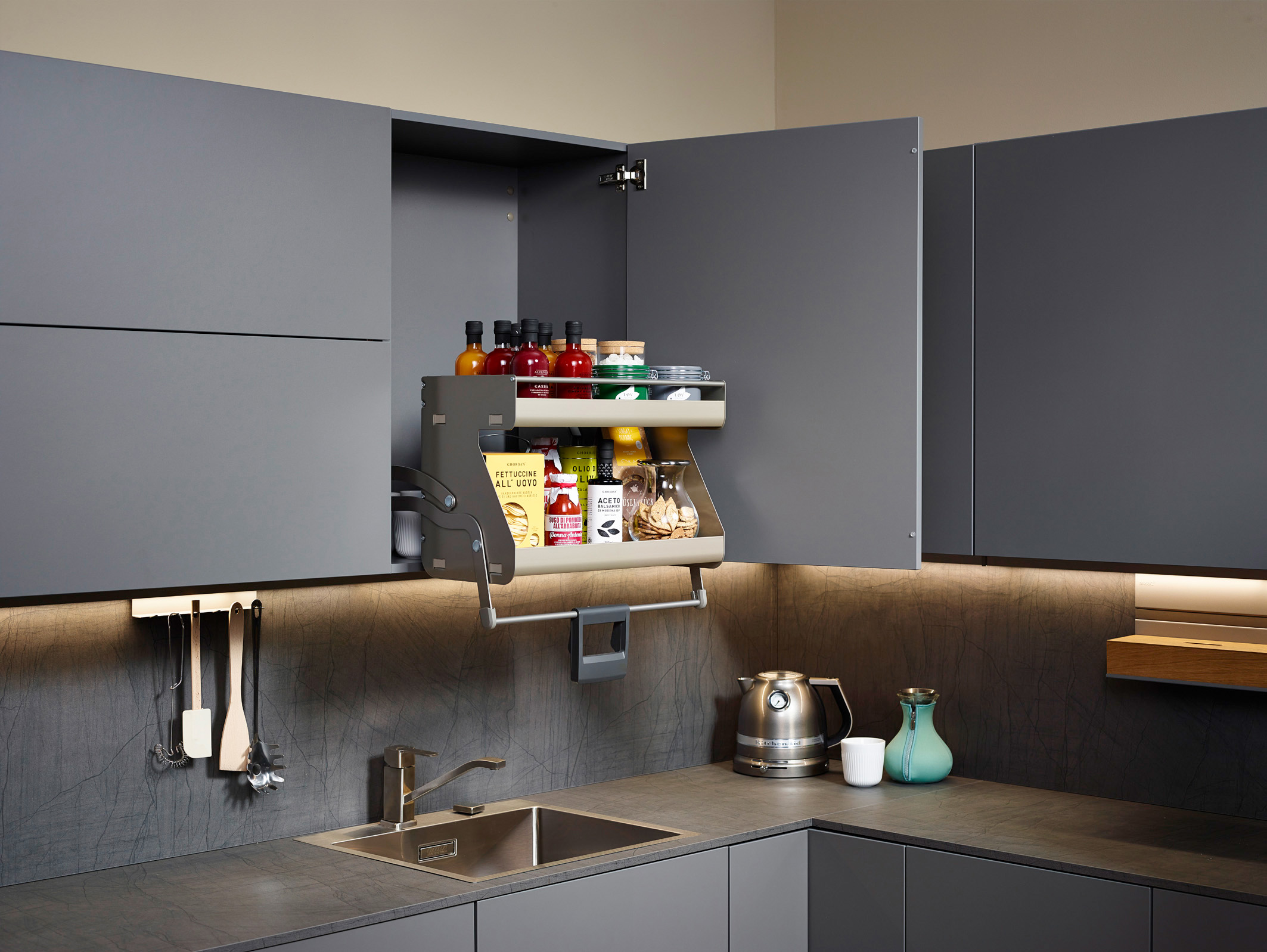 Für ein angenehmes Arbeiten in der Küche sorgen zudem spezielle Lösungen für die Hängeschränke. Dafür wird ein eigens konzipiertes Metallgestell in den Oberschrank montiert. Dank einer intelligenten Auszugstechnik lässt es sich mit einem Griff nach vorne und unten ziehen. Der Schrankinhalt – etwa in Regalen sortierte Gewürz- oder Vorratsdosen – wird so gewissermaßen vor den Schrank befördert und ist dann für kleine, ältere oder gehandicapte Menschen leichter erreichbar. Das Aufsteigen auf Leitern oder Hocker wird vermieden und Sturzgefahren werden reduziert.
