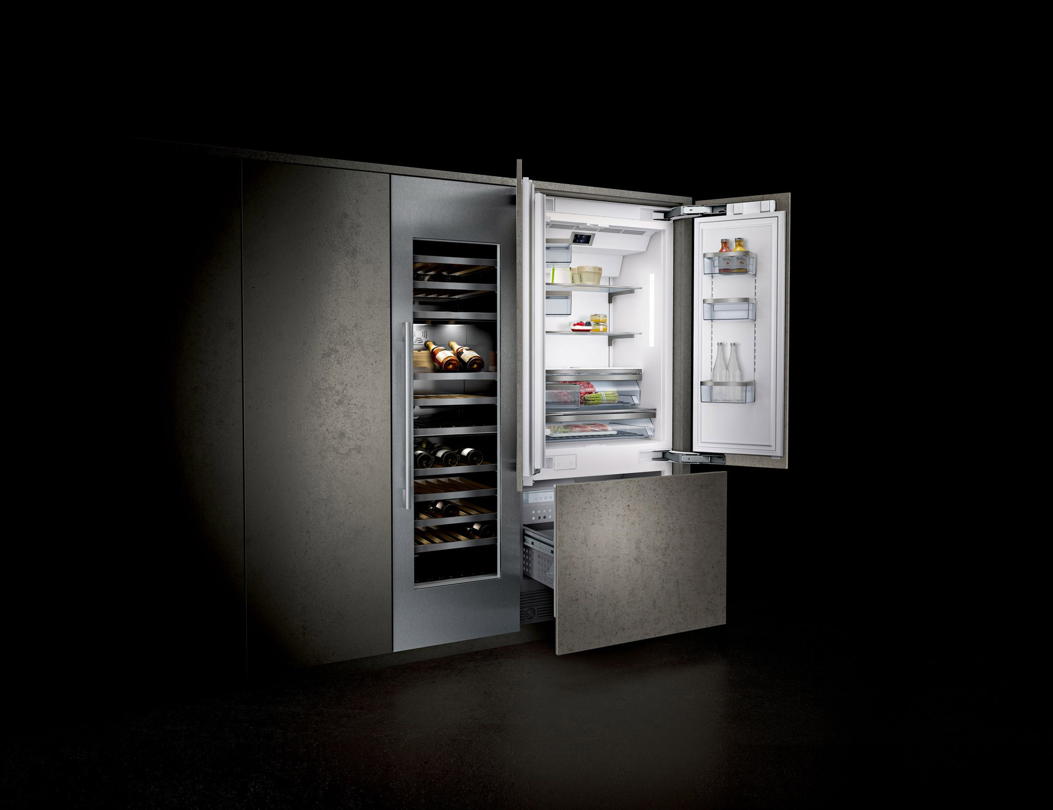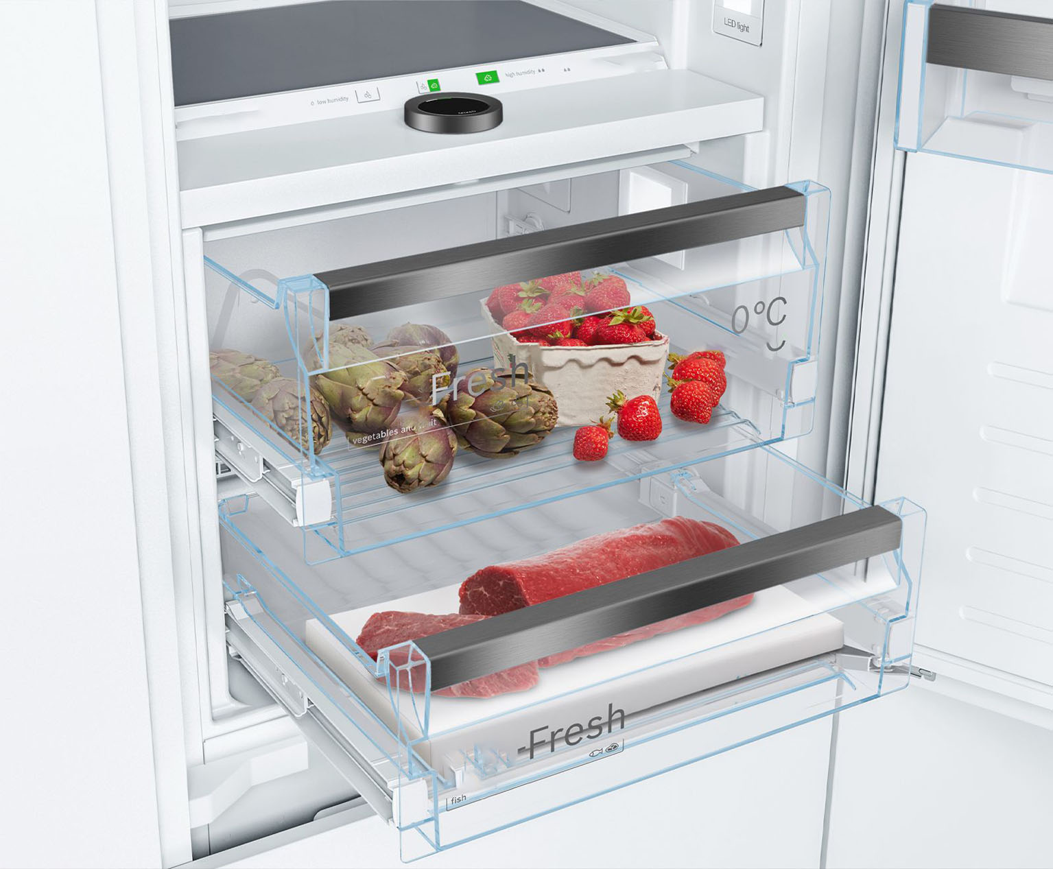 Viel und viele verschiedene Produkte möglichst lange frisch bevorraten zu können, ist ein Wunsch der Konsumenten. Auch ein optimaler und nachhaltiger Umgang mit den Lebensmitteln, denn eine länger anhaltende Frische führt zu weniger Lebensmittelverschwendung. Dafür sind die Kältegeräte mit cleverer HighTech ausgestattet. In speziellen Frischeschubladen finden sie das perfekte Klima für eine Verlängerung ihrer Frische vor: eine Temperatur knapp über 0 °C sowie eine ideale und regulierbare Luftfeuchtigkeit, damit sich Obst, Gemüse, Fleisch und Fisch so lange wie möglich frisch und appetitlich halten. Eine sensorgesteuerte Kühlung – ein Netzwerk aus Sensoren plus einer intelligenten Software – macht die Kältegeräte immer leistungsfähiger, in dem zum Beispiel die Umgebungs-, Kühlschrank- und Gefrierschranktemperatur kontrolliert wird. Oder elegante Innenrückwände aus Metall: Nach dem Öffnen des Kühlschranks gibt die Metallplatte ihre gespeicherte Kälte ab, damit das ursprünglich eingestellte Temperaturlevel im Nu wieder erreicht ist. Eine weitere tolle Frische- und Komfortlösung sind flexible Kältebereiche, die je nach Bedarf entweder zum Kühlen oder Gefrieren genutzt werden können. Dazu switchen die Besitzer einfach zwischen beiden Modi hin und her.