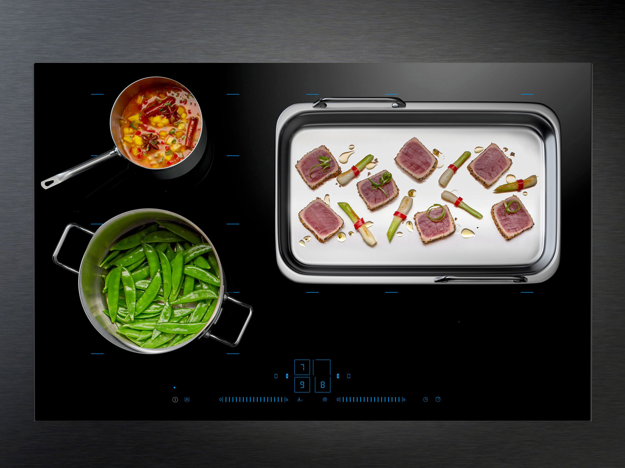 Induktionskochfeld mit kratzresistenter Beschichtung. Alle acht Kochzonen lassen sich zu einem XXL-Areal verbinden. Es bietet vordefinierte Temperaturstufen: z. B. zum Braten, Schnell-Sieden und Frittieren. (Foto: AMK)