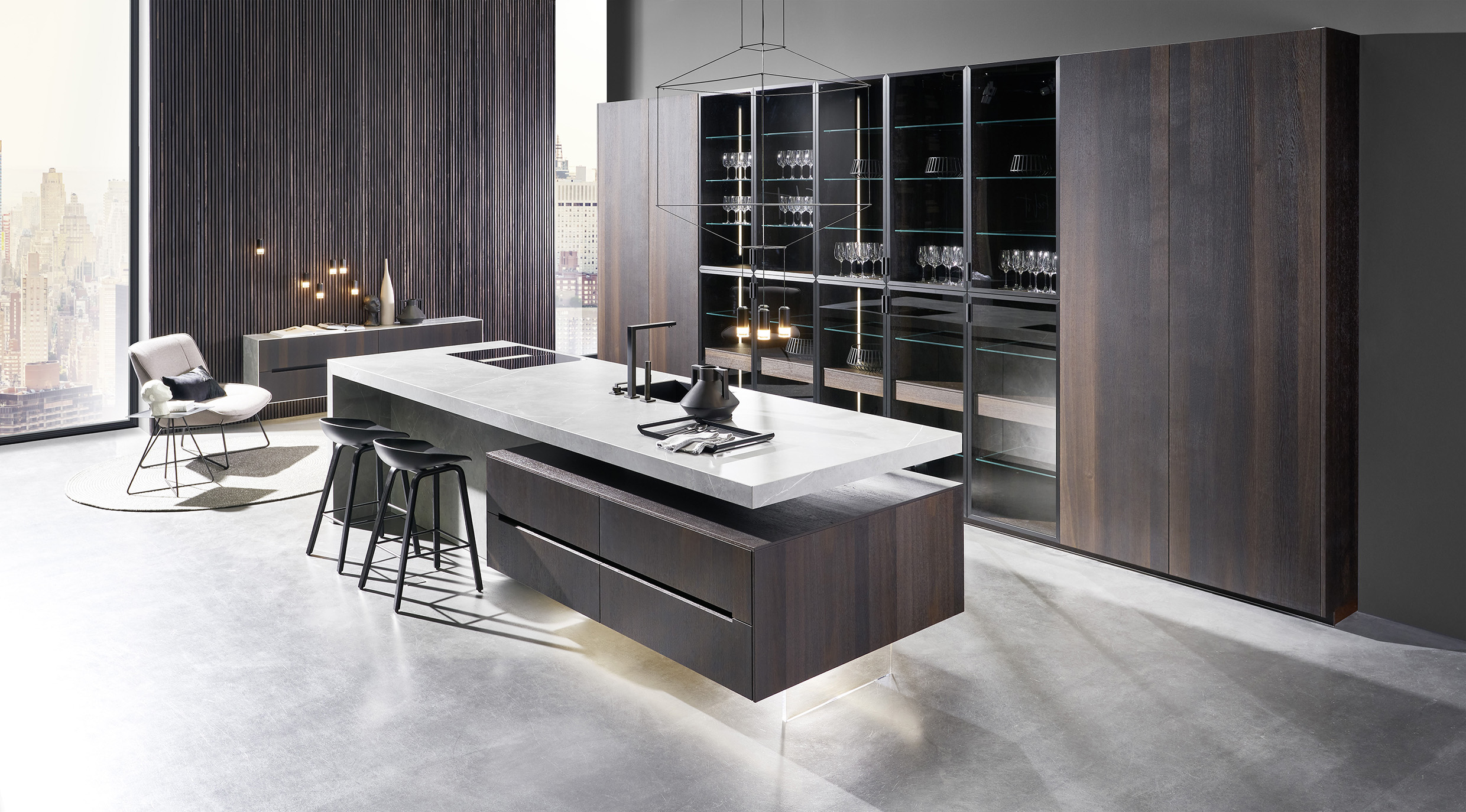 Wird beispielsweise ein klares, minimalistisches Wohndesign bevorzugt, so lässt sich das Gros der Einbaugeräte und des Küchenzubehörs von den Planungsspezialisten hinter geschlossenen Grifflos-Fronten verbergen. Das gesamte Innenleben mit den praktischen Ordnungshütern tritt dann nur zum Kochen in Erscheinung. Ansonsten machen sie sich wieder unsichtbar. Ist optische Transparenz hingegen erwünscht, dann stellen repräsentative Vitrinenschränke eine interessante Option dar – mit dunkel, leicht getöntem oder klarem Glas und dimmbarer Beleuchtung. So lässt sich bereits von außen auf einen Blick erkennen, was darin gut übersichtlich eingeordnet ist. Je nach Höhe der Einbau-Vitrinenschränke können hinter dem halb- oder volltransparenten Glas noch zusätzliche Innenschubkästen eingeplant werden, in denen hingegen ein Teil der Küchenutensilien unsichtbar verstaut wird.