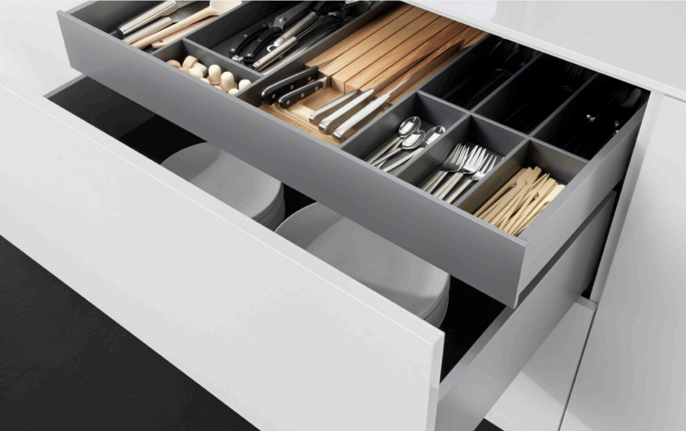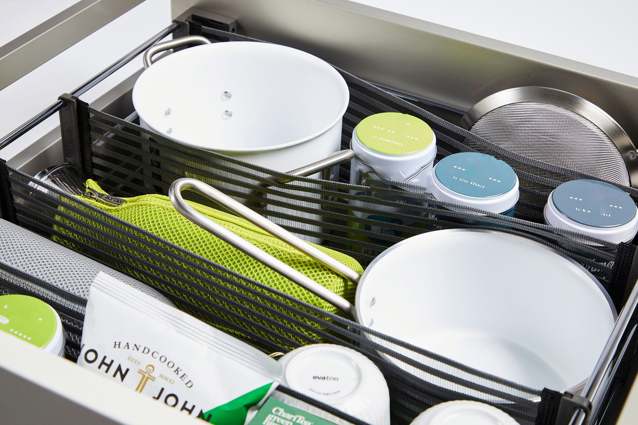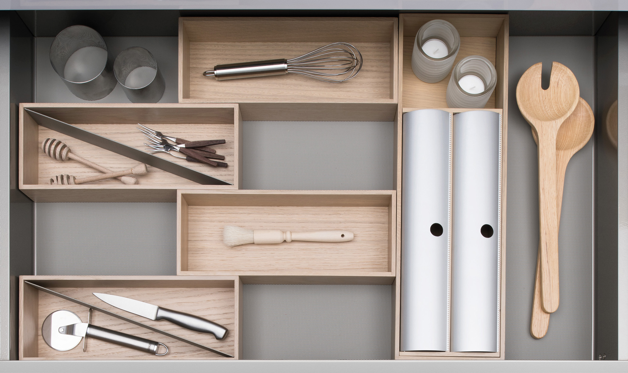 Groß ist die Freude, wenn beim Öffnen der Auszüge und Schubkästen alles schön geordnet zum Vorschein kommt. Individuell und rutschfest organisiert anhand eines der vielen gut durchdachten Innenorganisationssysteme in edlem Echtholz, Holzdekor, Metall oder Kunststoff. Ob als kompletter Besteckeinsatz mit fest vorgegebenen Einteilungen oder mit flexibel organisier- und versetzbaren Ordnungselementen – darüber entscheidet der persönliche Geschmack. Das können beispielsweise unterschiedlich große, verschiebbare Holzfächer und -Boxen sein; Schubkästen mit rutschfesten Halterungen oder Steckdübeln; dehnbare Einteilungen, die sich an jedes Staugut flexibel anpassen und somit auch unterschiedlich große oder geformte Küchen- und Kochutensilien sicher und rutschfest aufbewahren. Zur Reinigung kommen die Einteilungen einfach in die Waschmaschine.