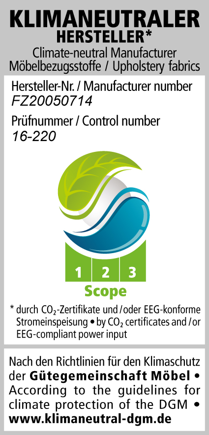 Bild: Das Label „Klimaneutraler Hersteller für Möbelbezugsstoffe“ von Rohleder. Grafik: DGM