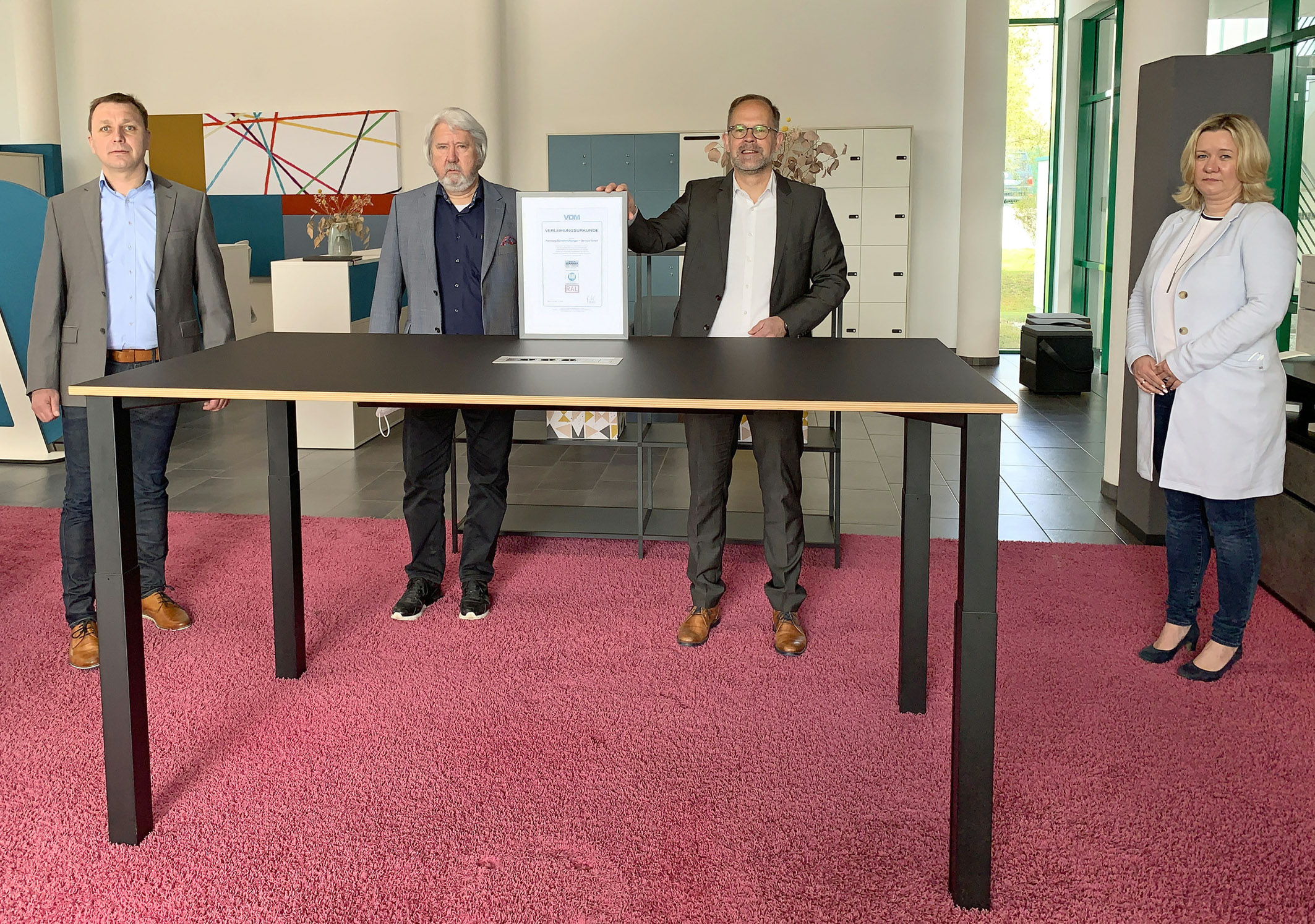 BAD HONNEF. Besondere Auszeichnung: Die PALMBERG Büroeinrichtungen + Service GmbH hat sich für das neue Gütesiegel „Möbel Made in Germany“ zertifiziert, das für Qualitätsmöbel aus deutscher Produktion steht. Das Familienunternehmen fertigt seine hochwertigen Büroeinrichtungen am Stammsitz im mecklenburgischen Schönberg sowie im benachbarten Rehna. „Wir freuen uns, dass wir mit dem Herkunftslabel unsere heimische Produktion und unsere hohen Qualitätsmaßstäbe noch besser dokumentieren können“, sagte PALMBERG-Geschäftsführer Uwe Blaumann bei der Urkundenübergabe durch Jan Kurth, den Geschäftsführer des Verbands der Deutschen Möbelindustrie (VDM). „PALMBERG ist einer der ersten Büromöbelhersteller, der unser neues Siegel erhält, und zeigt damit, dass auch dieses Möbelsegment im In- und Ausland von einer unabhängigen Zertifizierung profitieren kann“, freute sich Kurth über den Neuzugang im Kreis der 56 zertifizierten Hersteller.