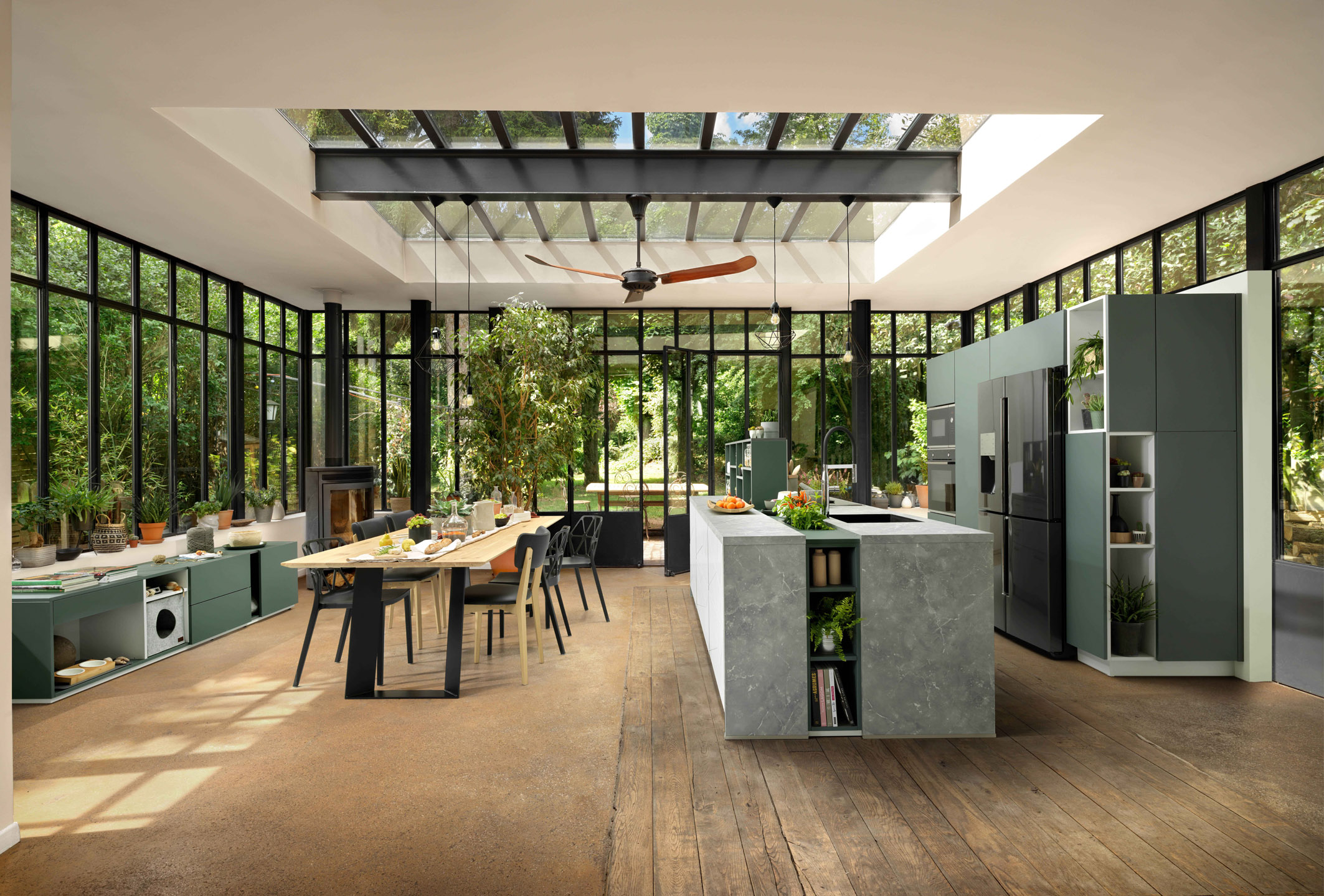 Ein lichtdurchfluteter Traum: Mattgrüne Fronten, eine Kochinsel in Weiß und Beton-Optik inklusive eines integrierten Kräutergartens und im Zent-rum die lange Esstafel als Treffpunkt mit der Familie und Freunden. (Foto: AMK)