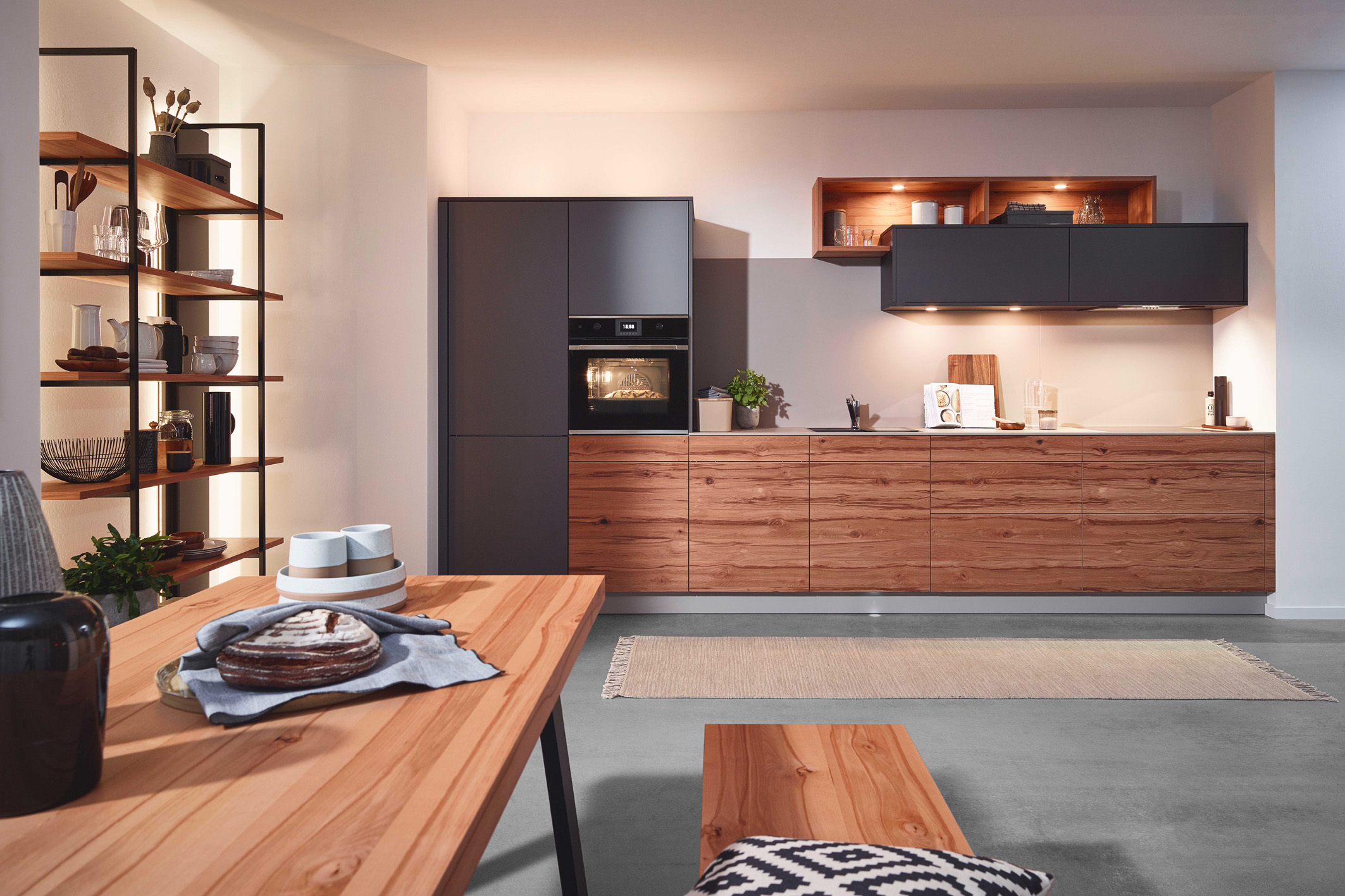 Ein Revival erlebt auch die gute alte Sitzbank. Ebenso wie die Tischplatte greift sie die hochwertigen, sandgestrahlten Fronten in astiger Kernbuche auf und verleiht der Wohnküche eine sehr behagliche Atmosphäre. (Foto: AMK)