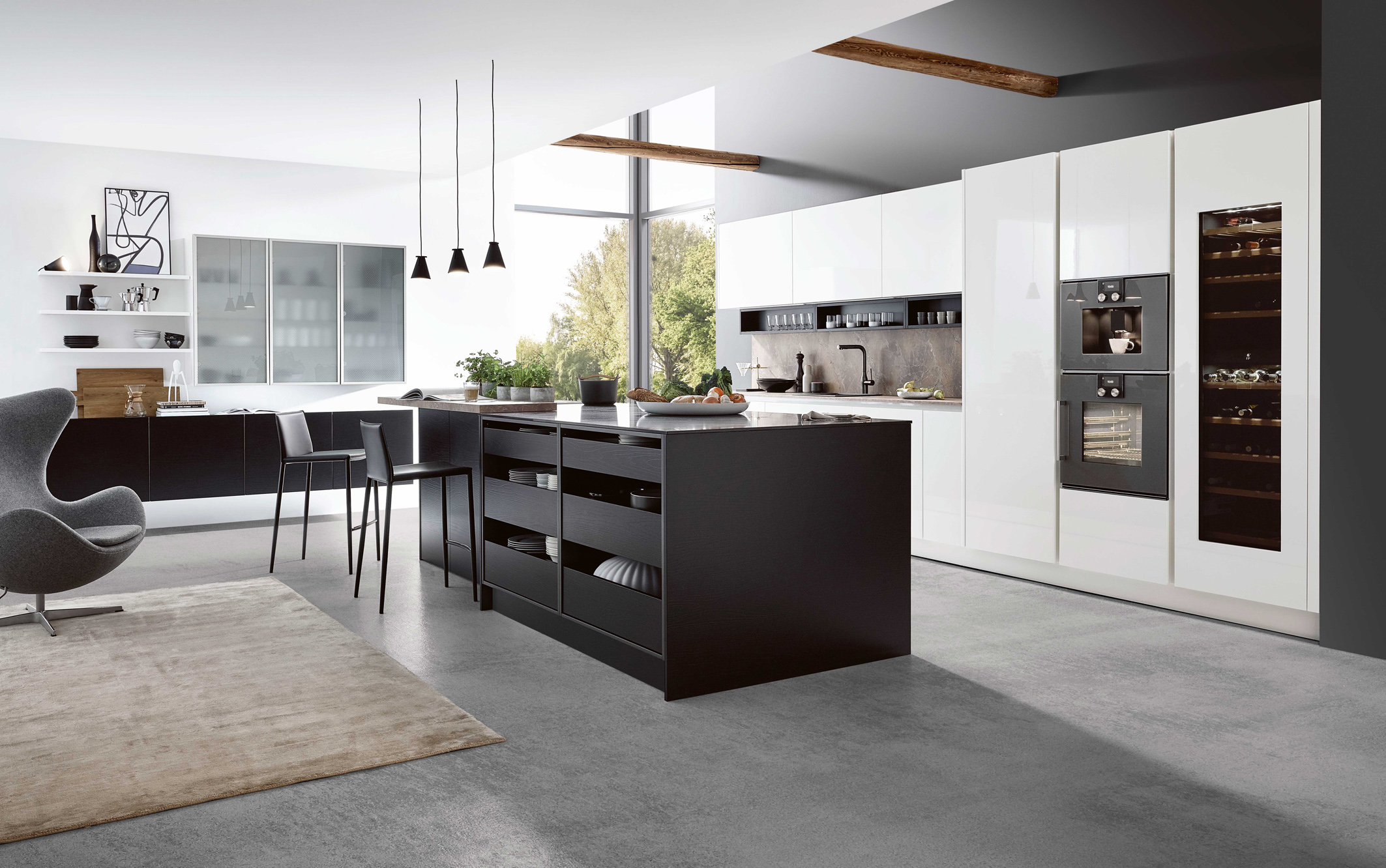 Black & White geben in dieser Lifestyle-Wohnküche den Ton an. Eine schöne Erweiterung der Kochinsel ist die aufgesetzte Esstheke aus hellem Holz mit zwei Barhockern – für kleine und größere Genüsse… (Foto: AMK)