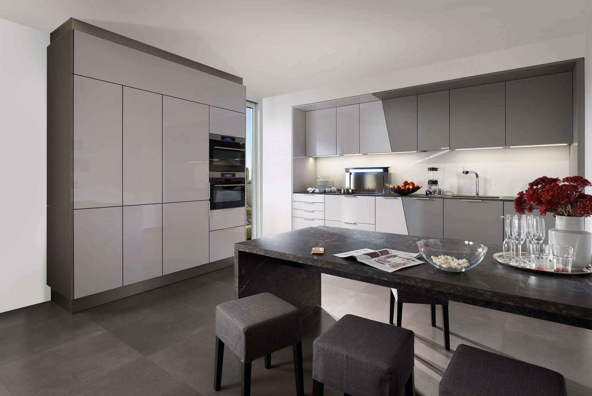 Gekonntes Farbspiel in verschiedenen Grau-Nuancen sowie matten und hochglänzenden Oberflächen. Mittendrin ein großer Essplatz mit einladen-den Polsterhockern, die sich platzsparend darunter schieben lassen. (Foto: AMK)