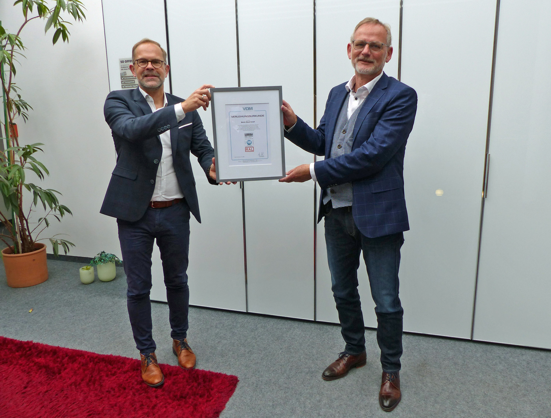 Bild: Staud-Geschäftsführer Wolfgang Schwägele (r.) nimmt die Urkunde für „Möbel Made in Germany“ aus den Händen von VDM-Geschäftsführer Jan Kurth in Empfang. Bild: Staud