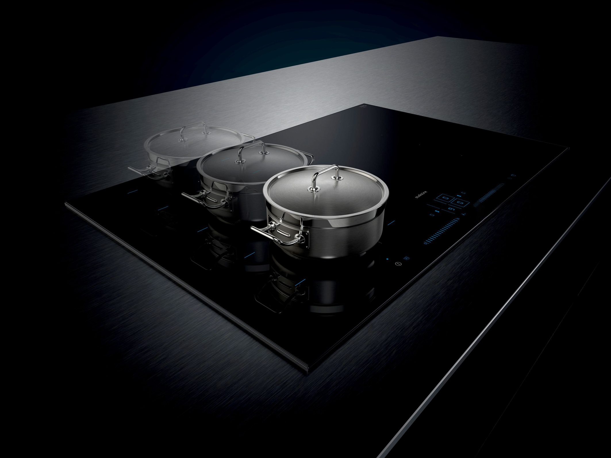 Freie Platzwahl auf dem Kochfeld: Die flexiblen Induktionszonen erkennen automatisch die Position und Größe des Kochgeschirrs. Es lässt sich z. B. auch in drei Zonen mit verschieden hohen Temperaturen einteilen. Das Kochgeschirr dann einfach nur noch in die passende Zone schieben. (Foto: AMK)