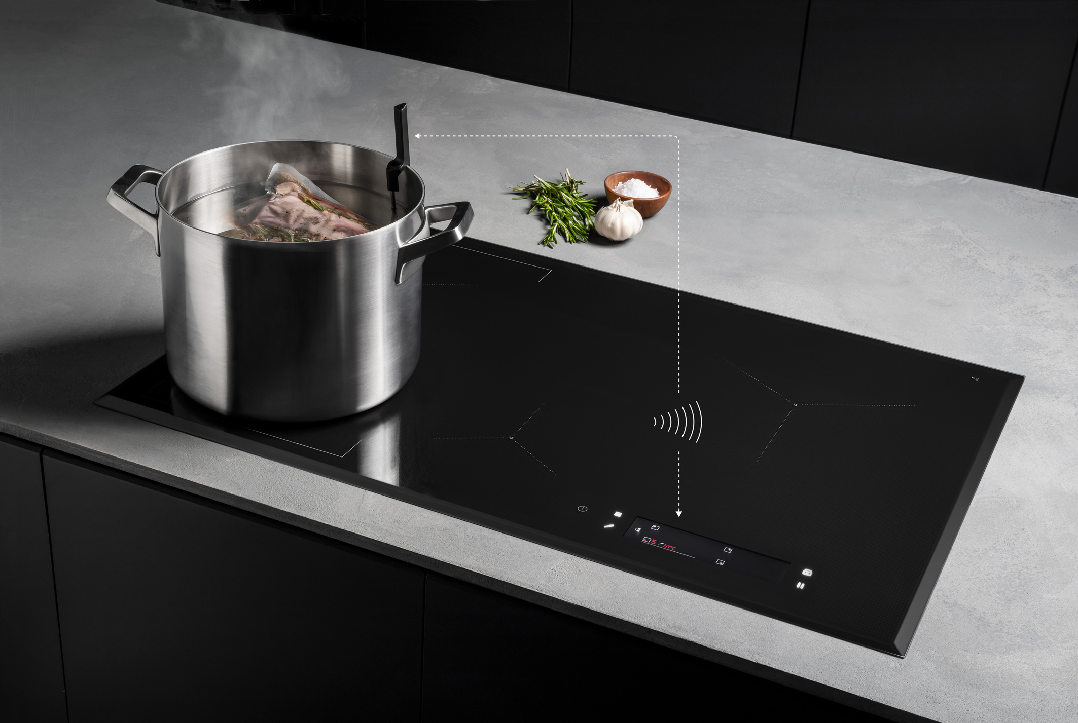 Selbst Sous-Vide-Garen ist auf einem Induktionskochfeld möglich, z. B. mithilfe eines kabellosen Sensors. Er misst die Wassertemperatur gradgenau, leitet sie automatisch an das Kochfeld weiter und gewährleistet, dass die Temperatureinstellung exakt eingehalten wird. Den gleichen Komfort ermöglicht so ein kabelloser Kerntemperatursensor auch beim Braten.