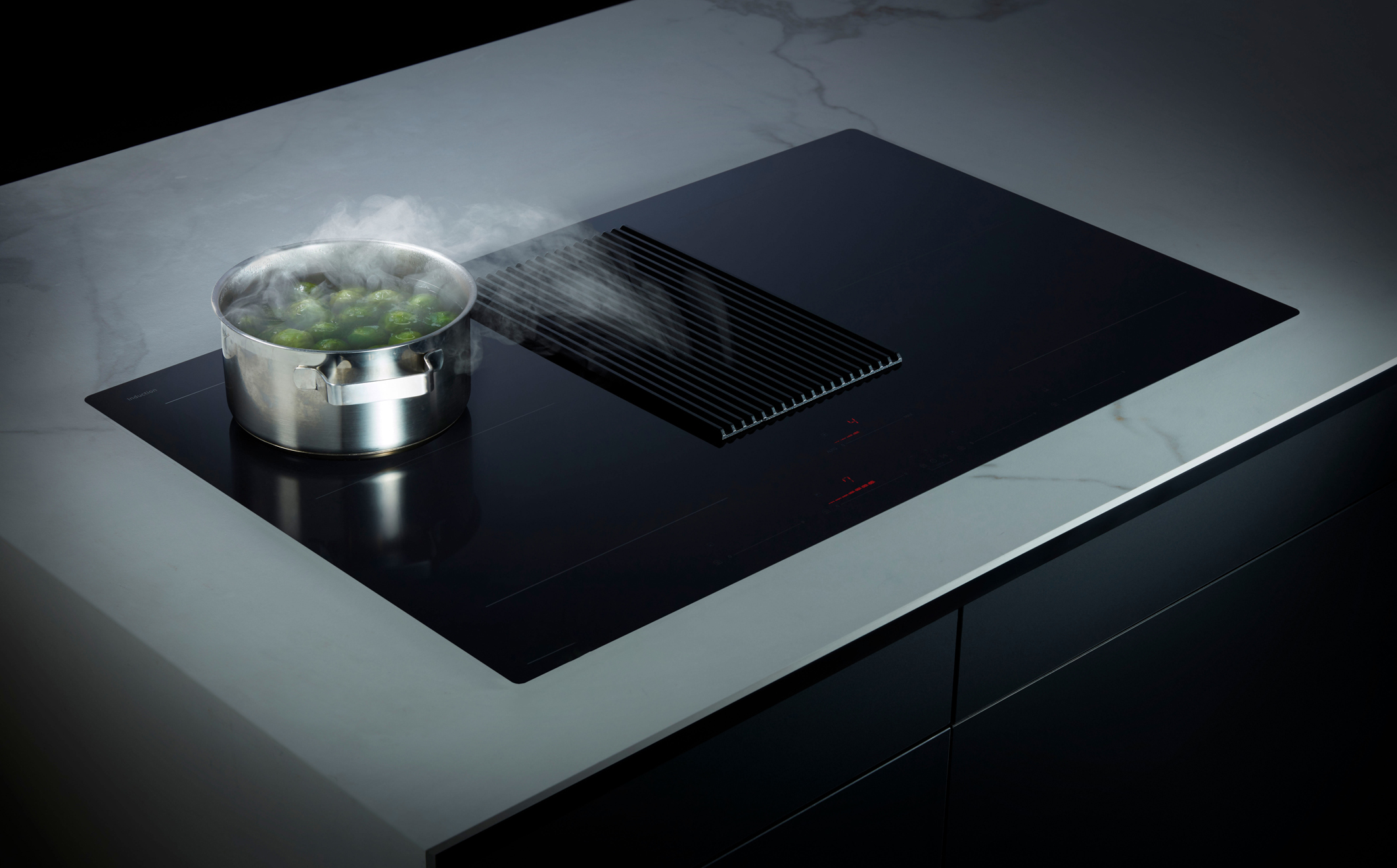 Dieses Induktionskochfeld mit integriertem Muldenlüfter ist u. a. mit einem vordefinierten Temperaturmanager zum Sieden (92 °C), Warmhalten (74 °C) und Schmelzen (42 °C) sowie einer automatischen Aufheiz-Funktion ausgestattet – damit das Kochgeschirr sein optimales Hitze-Level erreicht. (Foto: AMK)