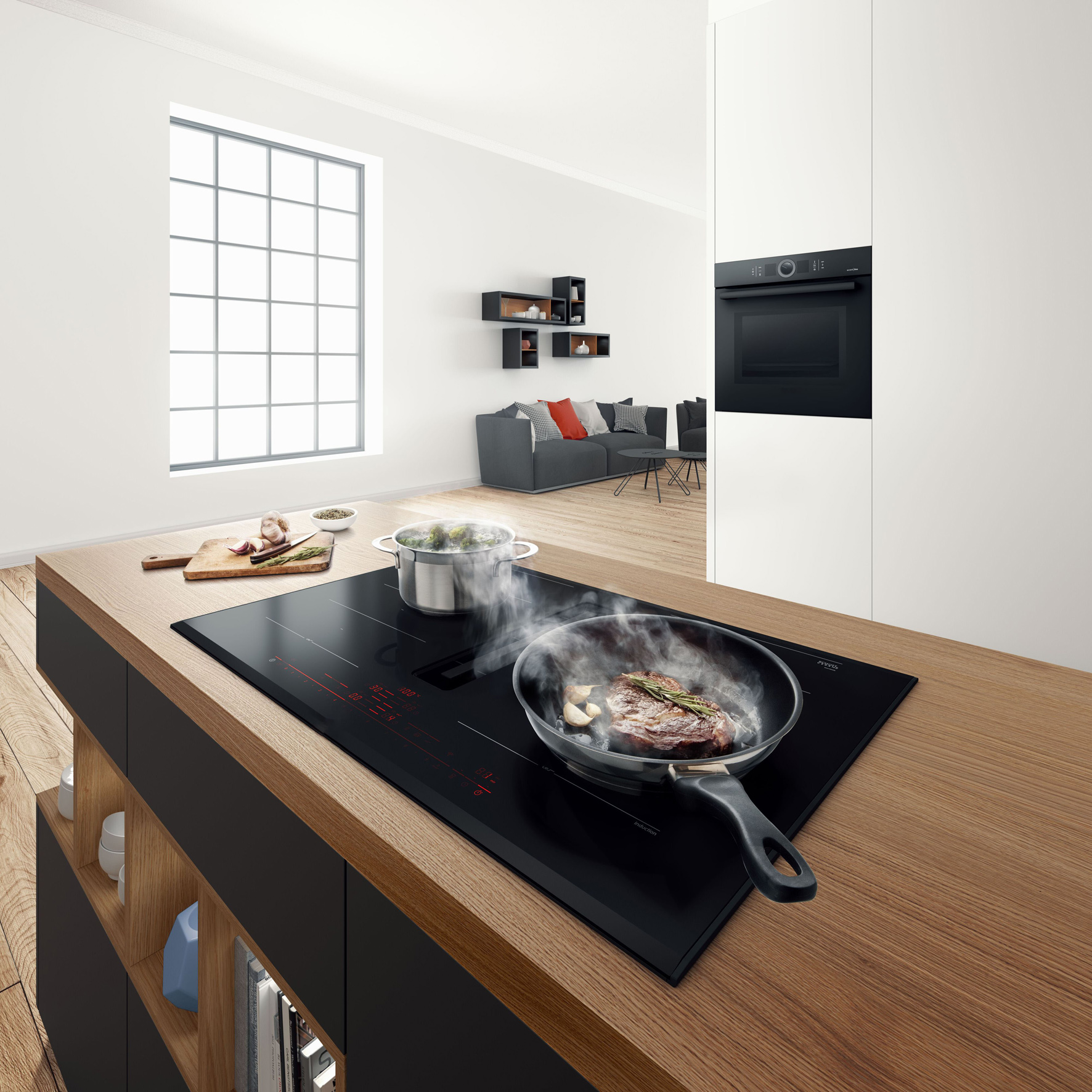 „Um das Kochen, Braten, Köcheln, Schmelzen, Garen und Grillen so angenehm, einfach und leichthändig wie möglich zu machen, sind die neuen Induktionskochfelder mit zahlreichen unterstützenden Funktionen ausgestattet“, sagt Volker Irle. Das reicht von der automatischen Erkennung von der Position und Größe des Kochgeschirrs bis zur Assistenz mit Künstlicher Intelligenz. Doch auch ohne KI übernehmen die Kochfelder mit ihren zahlreichen integrierten Komfort-Funktionen etliche Arbeitsschritte, um ihre Nutzer auf Wunsch deutlich zu entlasten. Beispielsweise durch ein automatisches Zusammenschalten und Trennen von Kochzonen – je nach Umfang und Form des platzierten Kochgeschirrs. Auf Kochfeldern mit integriertem Touchdisplay lassen sich u. a. die Leistungsstufen oder Garzeiten für die einzelnen Kochzonen per Fingertipp ganz einfach anwählen. Ist man unsicher, welche Temperatur für welche Speise ideal ist, helfen Assistenzprogramme weiter. Im Display erscheinen dann kurze Anleitungen und die richtige Temperatureinstellung.