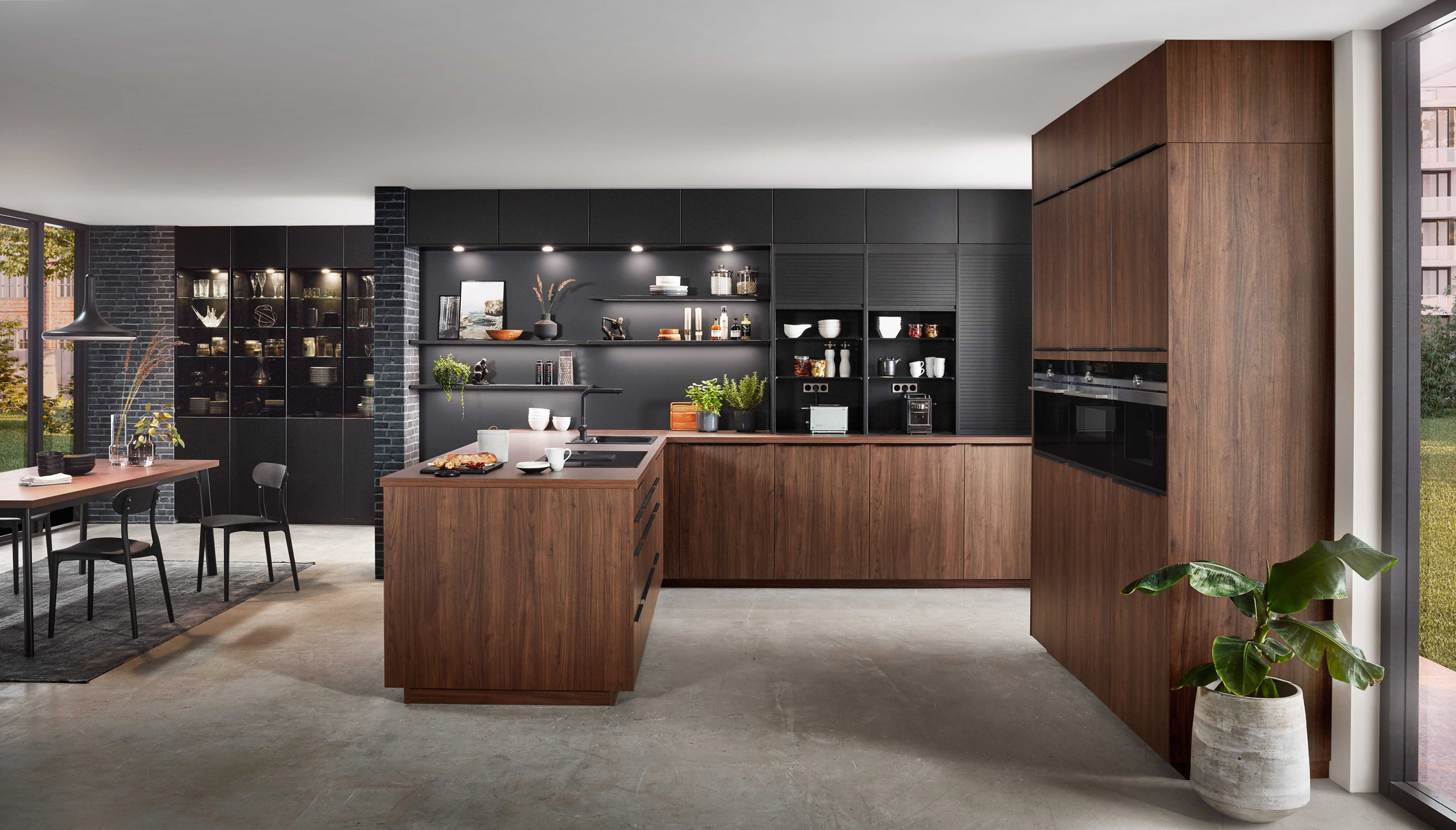 Trendthema Natürlichkeit und ein exklusiver Style. Wohnküche in eleganter Nussbaum-Nachbildung, der perfekte Kombi-Partner zu den supermatten schwarzen Fronten. Spannende Materialkontraste und eine minimalistische Formensprache machen diese attraktive Wohnküche zu einem „Must-have“. (Foto: AMK)Â