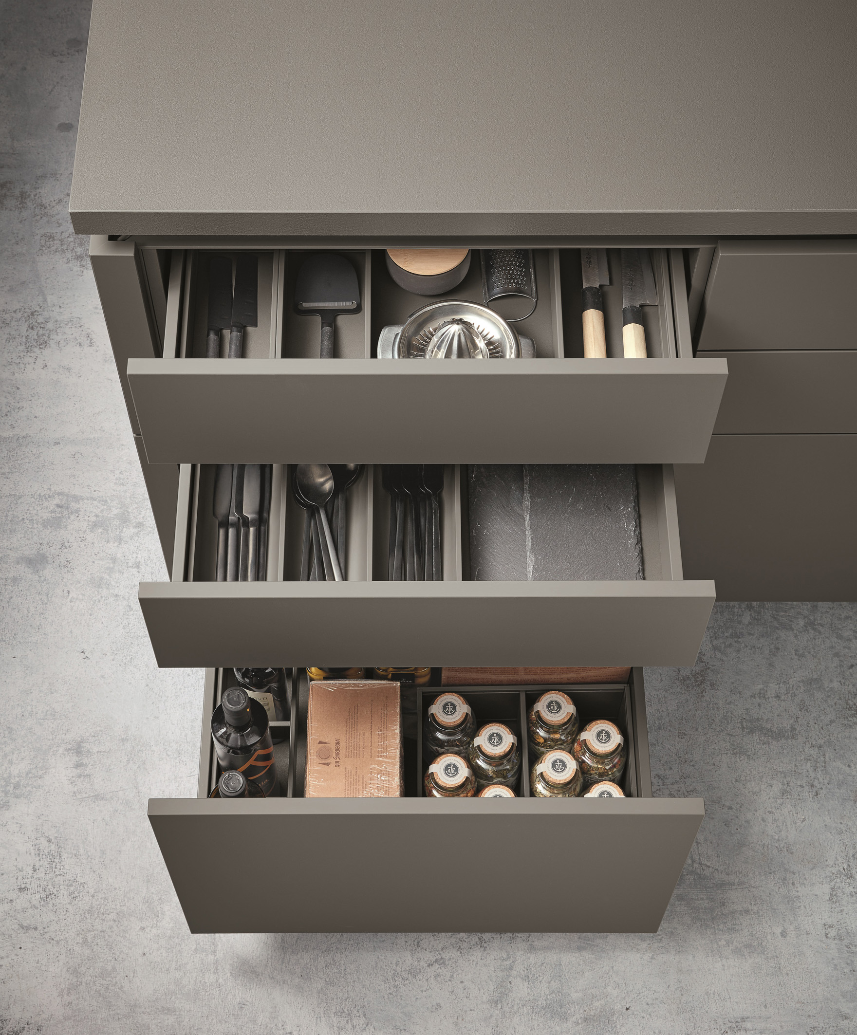 Ein zentrales Thema bei der Konzeptionierung einer neuen Küche ist die Stauraumplanung. So ist zunächst zu klären, wieviel Platz benötigt wird, um Geschirr, Besteck, Gläser, Kochutensilien und Gewürze unterzubringen. Sollen auch Lebensmittelvorräte, Tischwäsche, Kochbücher, Weinflaschen oder Getränkekisten verstaut werden – oder gibt es dafür eine andere Aufbewahrungsmöglichkeit, etwa in einem ebenfalls zu planenden Hauswirtschaftsraum? Falls eher wenig Stauraum erforderlich ist, können unter Umständen Unterschränke plus zierlichen Hängeregalen ausreichen, die mit Kräutertöpfen oder Wohnaccessoires dekoriert werden. Bei größerem Bedarf empfehlen sich Hoch-, Ober- oder Eckschränke mit ihren intelligenten Auszugssystemen. Auch bei der Entscheidung über die Form einer Küche ist der Platzbedarf mit ausschlaggebend. Statt einer einzeiligen oder L-förmigen Küche kann sich bei Haushalten mit mehreren Personen ein U-förmiges Modell oder eine Küche mit einer Insellösung anbieten – vorausgesetzt, der Raum verfügt über die entsprechende Größe. Besonders in offenen Küchen stellt eine Kochinsel einen schönen Übergang zum Ess- und Wohnbereich dar. Bei der Planung spielt zudem eine Rolle, ob in der Küche ein Essplatz eingerichtet werden soll. Dafür können beispielsweise ein Esstisch oder eine Theke an die Kochinsel angedockt werden.