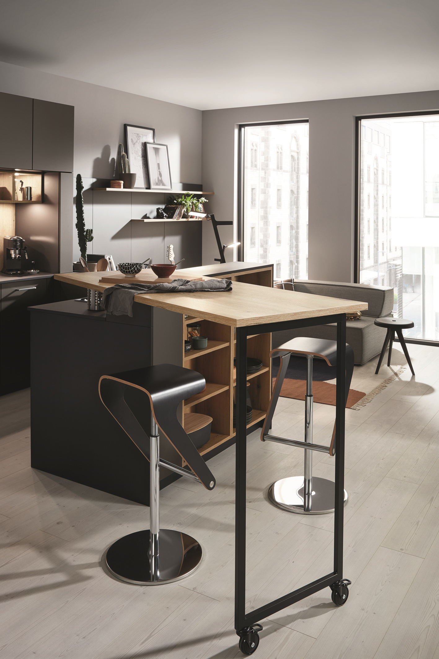 Bild 4: Multifunktionell: Mit dem schwenkbaren Tischmodul wird aus der ergonomischen Steharbeitsfläche im Handumdrehen ein Esstisch oder Homeoffice-Platz. Foto: VDM/Ballerina Küchen