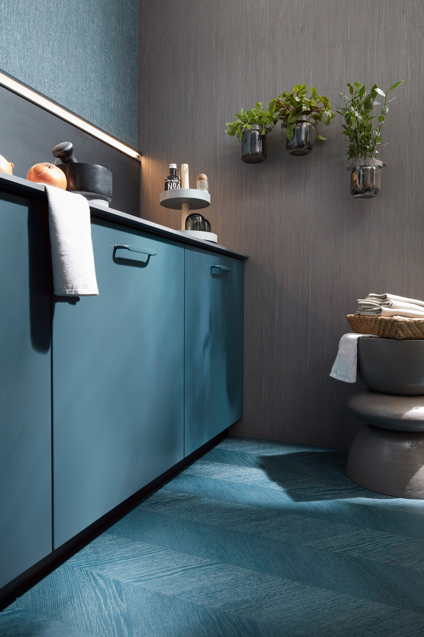Bild 9: Blau- und Grüntöne sorgen für Wohlbefinden und lassen sich gut mit Hölzern und anderen Naturmaterialien kombinieren. Ein Beispiel ist die neue Farbe „dive deep!“ – hier als Küchenfront, Wandverkleidung und Fischgrät-Fußboden. Foto: VDM/Colornetwork