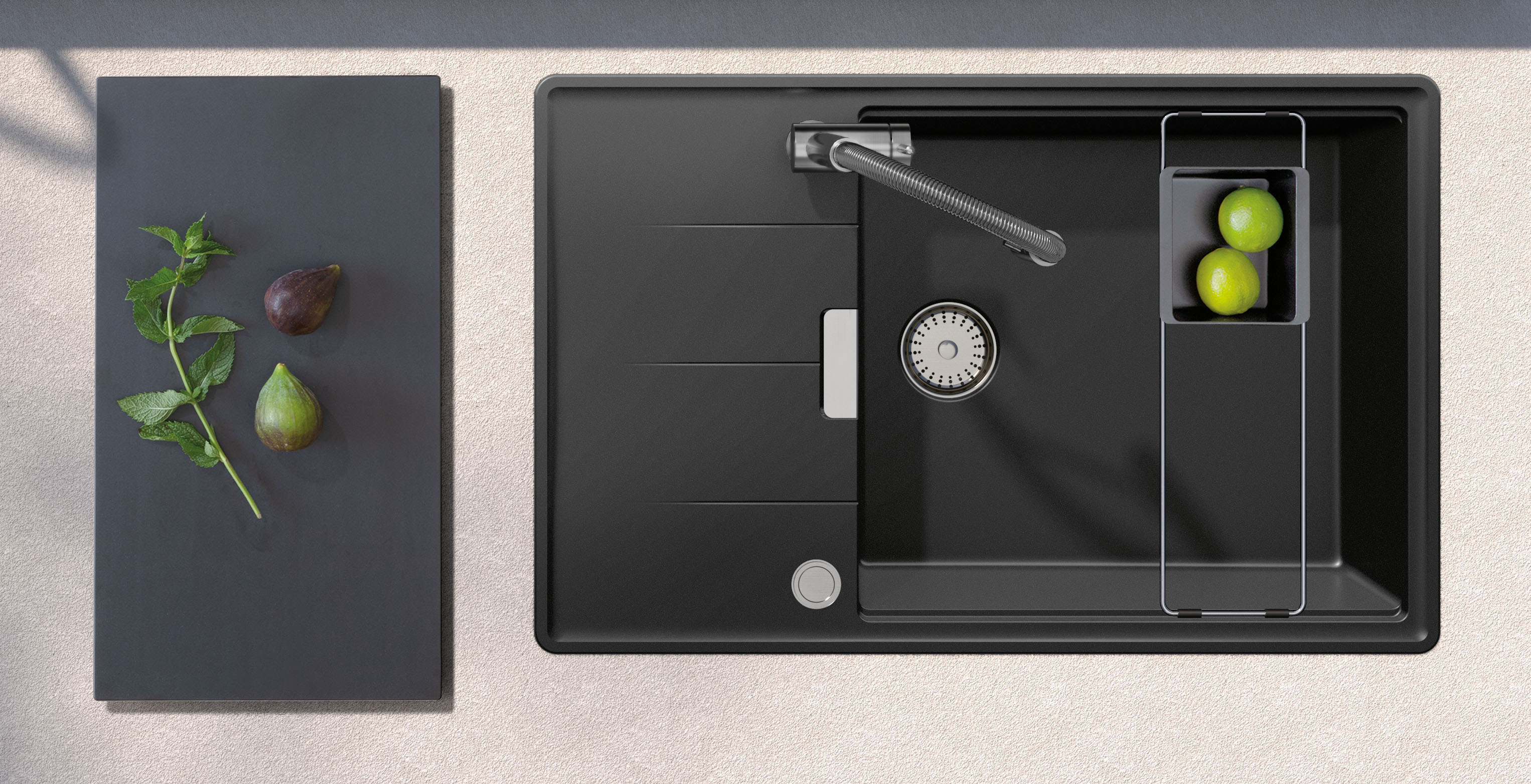 Raumwunder mit großem Beckenvolumen: Diese Granitspüle in einer ausgewogenen und modernen Linienführung sorgt für Spülkomfort im Kompaktformat. Vielseitiges Zubehör macht sie zum Multitalent am Wasserplatz. (Foto: AMK)