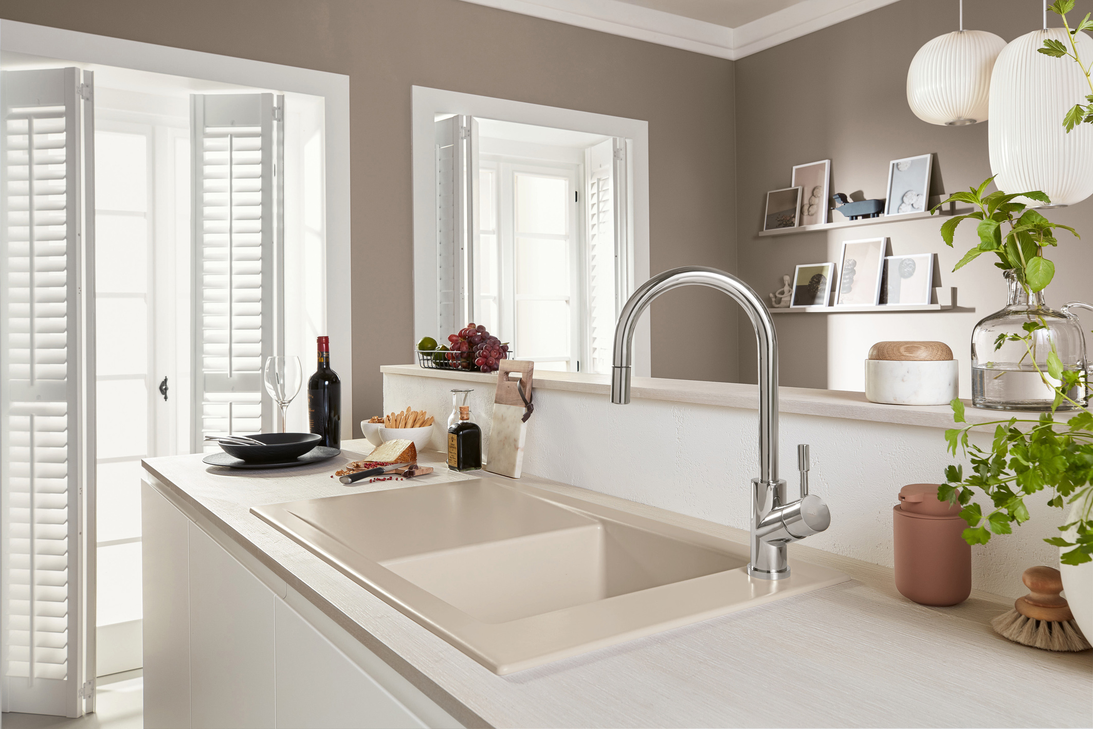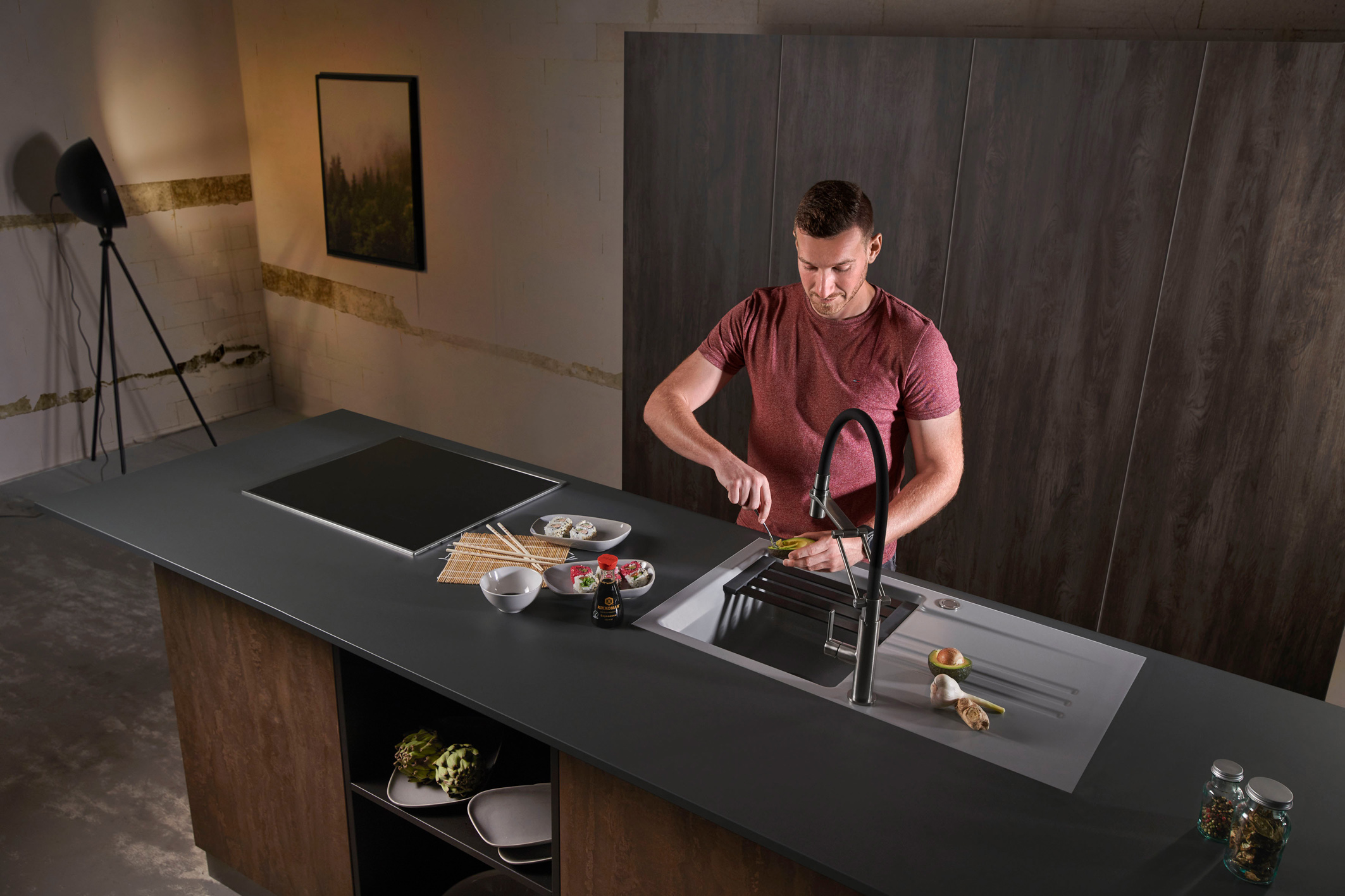 Ein dritter starker Hingucker neben hochwertigen Marken- und Design-Modellen in Edelstahl oder Keramik sind Granit-Spülen aus Quarzkomposit. Der innovative Verbundwerkstoff zeichnet sich durch einen sehr hohen Anteil (80 Prozent) an natürlichem Quarzsand aus, dem härtesten Bestandteil von Granit. Im Gegensatz zu kühlem Granitgestein fühlen sich die glatten Oberflächen dieser eleganten Spülen angenehm temperiert an. Gleichzeitig sind sie extrem hart und daher sehr strapazierfähig und kratzfest. Granitspülen sind farb- und UV-beständig, bruchfest, unempfindlich gegenüber Kälte, Hitze und küchenüblichen Säuren sowie reinigungsfreundlich. Wird auf besondere Hygiene Wert gelegt, dann kommt eine Spüle mit zusätzlicher antibakterieller Oberflächenveredelung infrage. Aufgrund des großen Angebots an attraktiven bis hin zu außergewöhnlichen Farbstellungen findet sich für jedes Küchendesign das passende Modell. Und wer eine besonders nachhaltige Granitspüle sucht, der wird auch in dieser Disziplin fündig: z. B. eine Spülenmaterialität, die zu 99 Prozent aus natürlichen, nachwachsenden oder recycelten Rohstoffen besteht und nach einem langen Lebenszyklus wieder in einen geschlossen Recycling-Kreislauf zurückgeführt werden kann.