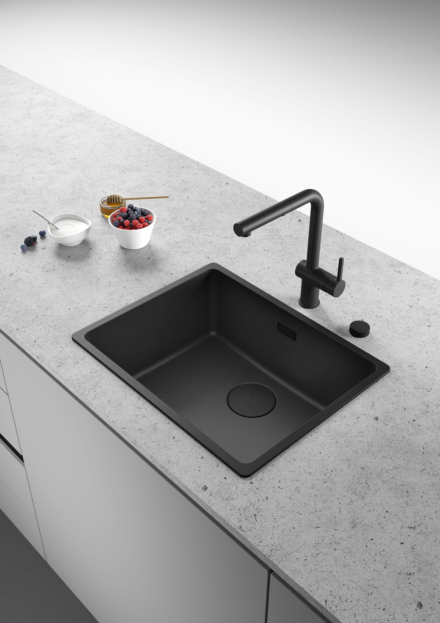 Robuste Granitspüle mit Silberionen-Technologie (reduziert Bakterienwachstum zu 99 %) – und dazu alles komplett in der Trendfarbe Schwarz, sogar sämtliche Details wie z. B. Überlauf, Drehknopf und Abdeckkappe. (Foto: AMK)