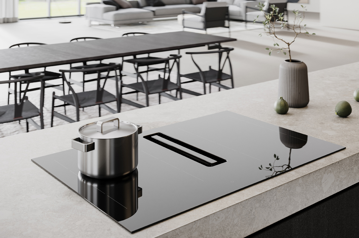 (iF/Red Dot) Puristisch-zeitlos: Premium-Induktionskochfeld mit integriertem Dunstabzug. Die hochwertige Oberfläche mit dem minimalistischen Liniendesign trägt zu dem eleganten Erscheinungsbild bei. Innovative Funktionen sowie ein leichtes, intuitives Handling vereinfachen das Kochen und Lüften. (Foto: AMK)Â