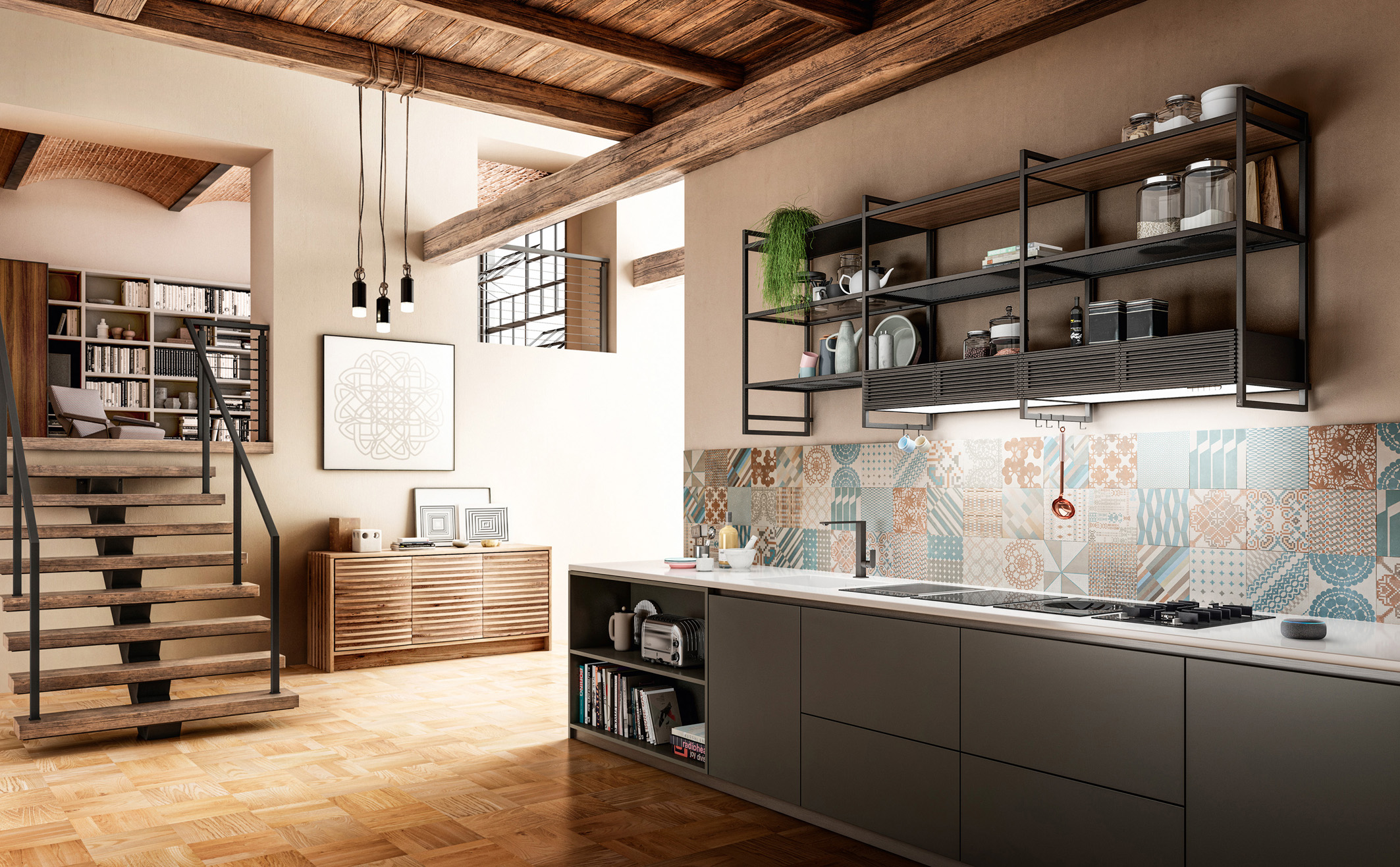 (German Design) Vielfach ausgezeichnet – der Dunstabzug ist hier nahezu unsichtbar in ein modular konzipiertes Regalsystem integriert, das an einer Wand oder von der Küchendecke hängt und sich individuell ergänzen lässt, z. B. mit weiteren Regalen, LED-Lichtelementen und diversem Zubehör. (Foto: AMK)