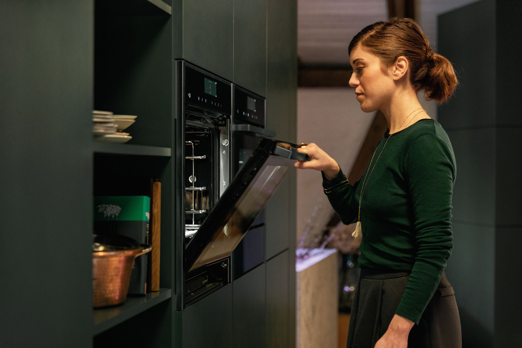 (iF) Ein einzigartiges Konzept: Die Tür verschwindet beim Öffnen mit nur einem Handgriff komplett in einem Fach unter dem Backofen. Dies erleichtert das Herausnehmen und Nachwürzen von Gerichten und schafft zugleich mehr Raum in kompakten Küchen, da nichts im Weg steht. (Foto: AMK)