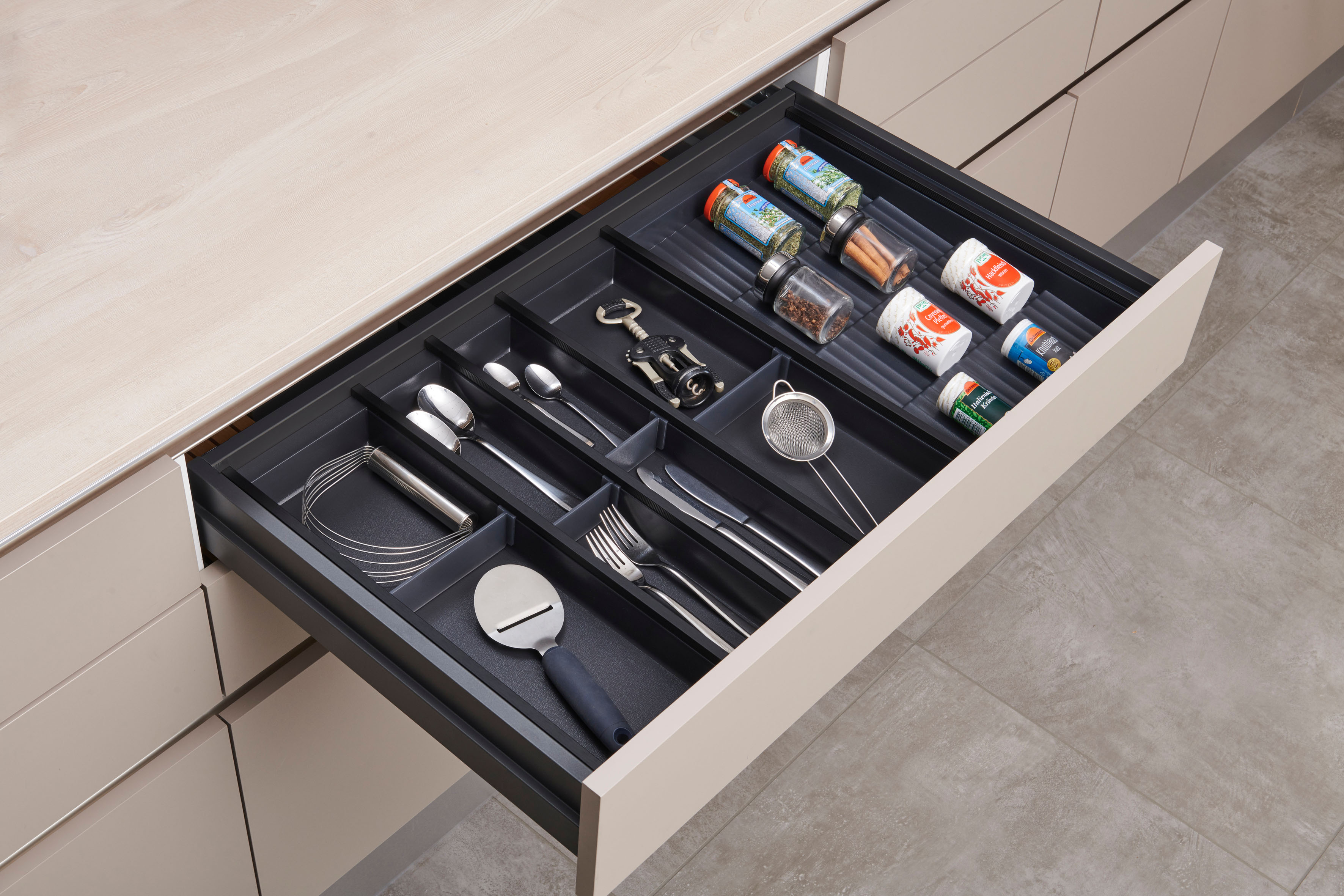Angefangen bei der Planung der Unterschränke mit ihren individualisierbaren sowie hoch belastbaren Schubkastensystemen. Sowie den Auszügen mit ihren vielen schicken Ausstattungsvarianten – von zweckdienlich bis hochwertig und sehr elegant. Dass dies z. B. auch mit einem achtsamen und verantwortungsvollen Umgang mit unseren Ressourcen Hand in Hand gehen kann, zeigen neue nachhaltige Innenausstattungen für Schubkästen und Auszüge. Ein Repräsentant hierfür besteht u. a. aus zu knapp 70 Prozent schnell wachsenden, heimischen Bastfasern und einem Bindemittel auf Wasserbasis. Der mit einem Nachhaltigkeitspreis prämierte Verbundwerkstoff ist zudem sehr leicht, widerstandsfähig und lebensmittelverträglich. Nur wenige modulare Organisationselemente – wie ein Besteck- und Multifunktionseinsatz, breite und schmale Ausgleichsböden, eine Multifunktionseinheit und Einsteckstege – lassen sich hier einfach und unabhängig von den Schubladenbreiten nach dem Baukastenprinzip individuell arrangieren.    Â