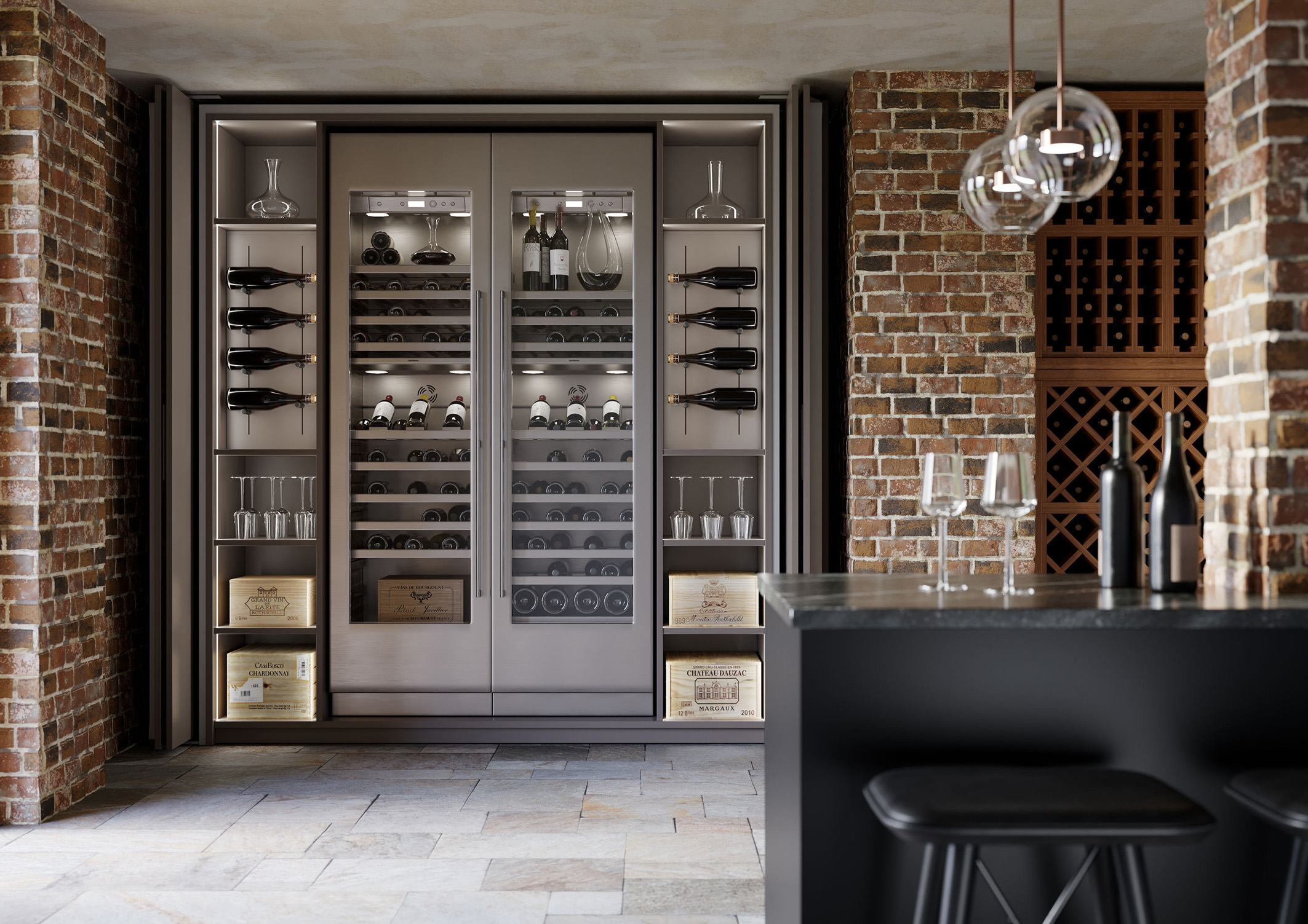 Eindrucksvoll organisiert und inszeniert hinter Einschubtüren (Pocket Doors), die den Blick auf den kostbaren Vorrat je nach Gusto gar nicht, partiell oder ganz freigeben – mithilfe von zwei verbundenen und sichtbar zusammengeklappten Türen oder komplett in den Korpus eingeschoben. (Foto: AMK)