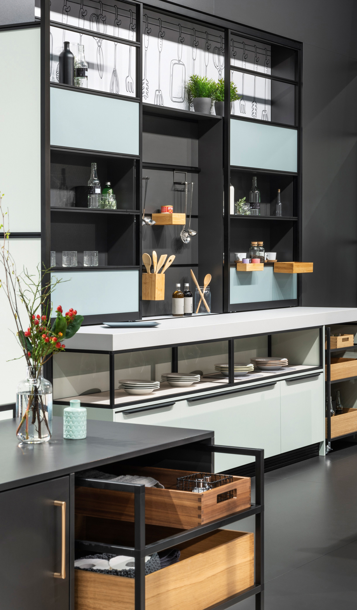 Wie sich eine perfekte Organisation hinter den Möbelfronten zudem noch wirkungsvoll inszenieren lässt, zeigt sich exemplarisch anhand der neuen Einschubtürsysteme (Pocket Doors). Je nach spontanem Bedarf gewähren sie einen vollen, partiellen oder überhaupt keinen Einblick auf das wohlgeordnete Innenleben dahinter. Mit Pocket Door Systemen lässt sich z. B. ein gut sortiertes Wein-Kabinett planen und auf Wunsch auch komplett verbergen. Ebenso eine große oder kleinere Küchenzeile oder ein in die Küche integrierter Homeoffice- oder Laundrybereich. Ein innovativer Mechanismus ermöglicht dabei die gleichzeitige Öffnungsbewegung von zwei miteinander verbundenen Türen. Je nach Ausführung des Pocket Systems werden sie einfach nur sichtbar zusammengeklappt oder ganz in den Möbelkorpus eingeschoben. Â