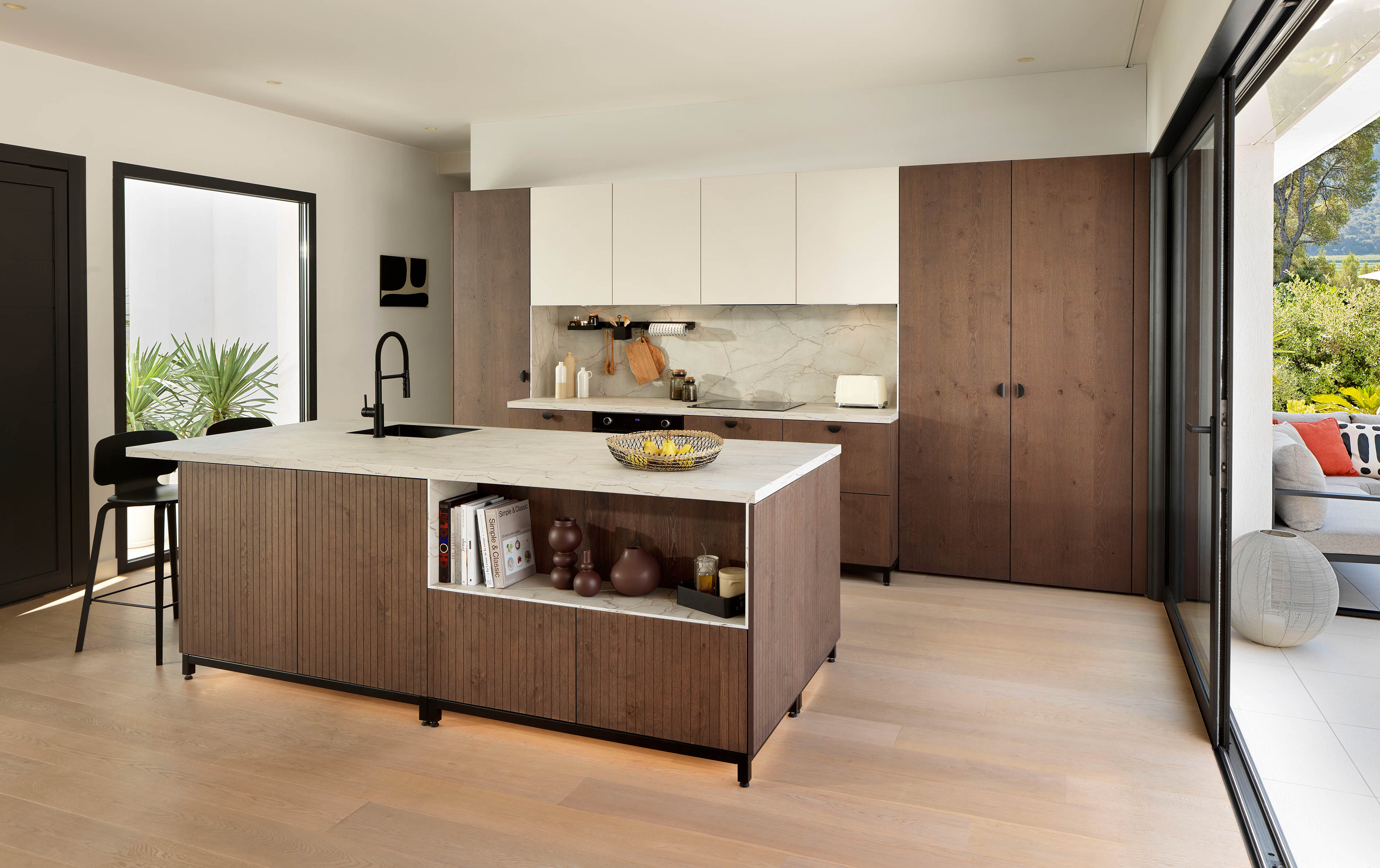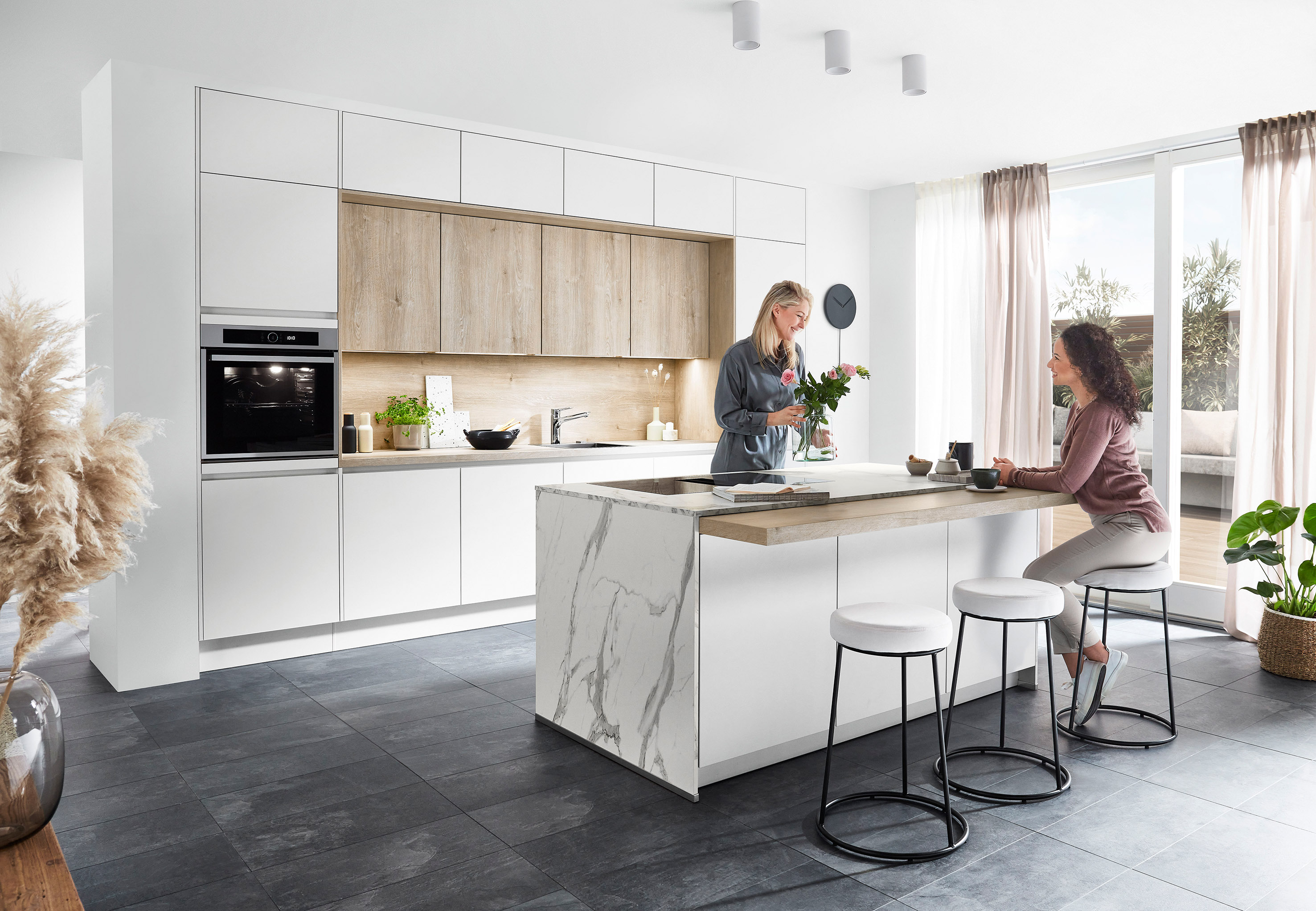 Wohnküche im angesagten Japandi-Style, eine Kombination aus skandinavischem und japanischem Einrichtungsstil. Hier in einem wohnlichen Mix aus astigem, sehr naturgetreuem Eichefurnier mit glatter Oberfläche sowie mit trendstarken vertikalen Nuten, kombiniert mit Marmor-Optik in Greige. (Foto: AMK)