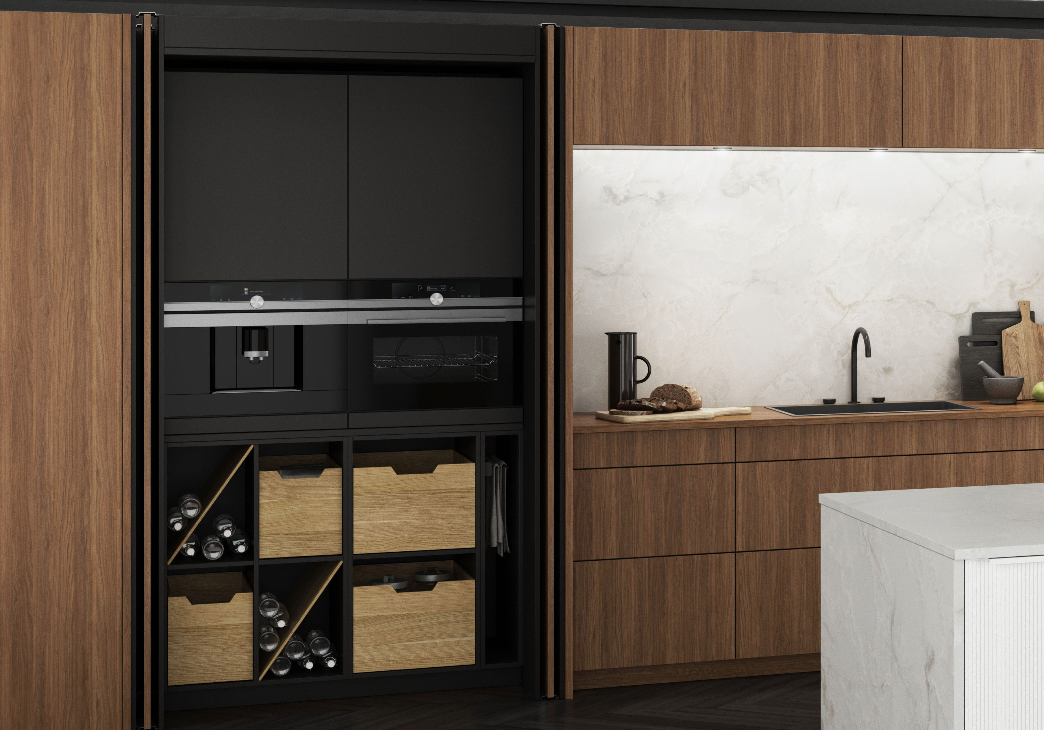 Ein Traum in Nussbaum, Weiß seidenmatt und Marmor. Die weißen Rillenfronten mit ihren feinen, farbgleichen Griffleisten bilden einen schönen Kontrast zum eleganten Nussbaum-Furnier und Akzenten in Marmor (Dekor). Ein weiterer Eyecatcher sind die komplett einschiebbaren Pocketdoors. (Foto: AMK)